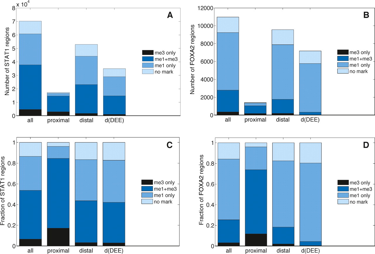 Relationships between regions enriched in STAT1 or FOXA2 and in H3K4me1 and H3K4me3. (A,C) Number and fraction of all, proximal, and distal STAT1 binding sites, and distal binding sites filtered by predicted TSS (DEE) in IFNG-stimulated HeLa cells. (B,D) As for STAT1, but for distal FOXA2 binding sites in mouse adult liver. A binding site was distal if the location of its maximum coverage was farther than ±2.5 kb from a transcriptional start site of UCSC known gene.