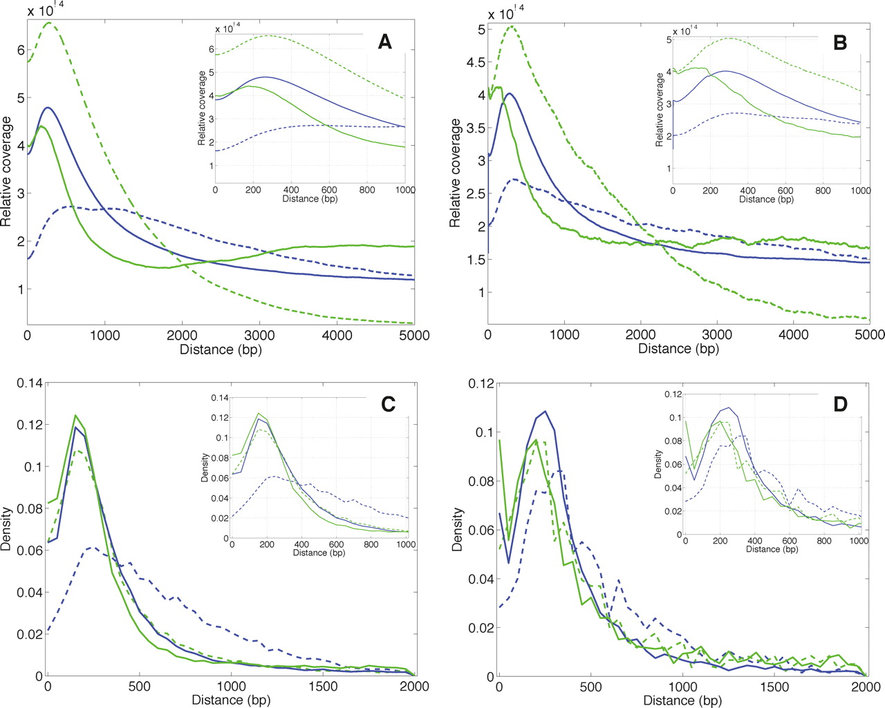 Spatial relationships for TF-associated H3K4me1 and H3Kme3. Coverage profiles associated with STAT1 in IFNG-stimulated HeLa cells (A) and FOXA2 in mouse adult liver (B). Density distributions for distances between the location of maximal coverage for a region enriched in STAT1 (C) or FOXA2 (D) and the closest H3K4me1- or H3K4me3-enriched region. (Blue lines) H3K4me1; (green lines) H3K4me3; (solid lines) profiles for distal TF regions; (dashed lines) profiles for proximal TF regions. We distinguished these groups using a ±2.5-kb threshold distance from UCSC hg18 or mm8 known gene TSS. The area under each curve was normalized to 1.0.