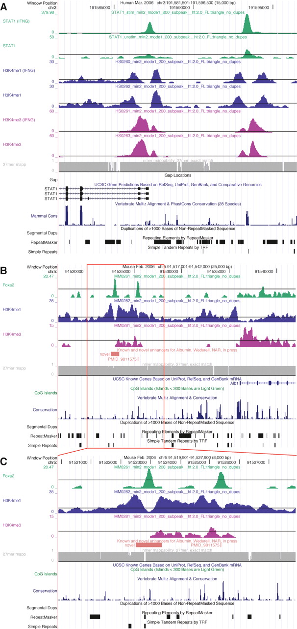 Examples of TF, histone modification, and read mappability profiles. (A) A 15-kb UCSC hg18 genome browser view around the 5′-end of the STAT1 gene (chr2:191,581,501–191,596,500). The gene is transcribed from right to left. Custom tracks are XSET coverage profiles for (from the top) STAT1, H3K4me1, and H3K4me3. Pairs of profiles show IFNG-stimulated cells above and unstimulated cells below. (B,C) Overall 25-kb (chr5:91,517,001–91,542,000) and detailed 8-kb (chr5:91,519,901–91,527,900) UCSC mm8 genome browser views that include a known and a novel enhancer for the albumin (Alb1) gene (Wederell et al. 2008). The gene is transcribed from left to right. ChIP-seq coverage profiles are (from the top) FOXA2, H3K4me1, and H3K4me3 in mouse adult liver. (A–C) The final custom track is a profile for (gray) 27-mer exact match mappability; (black horizontal lines) coverages (heights) that correspond to profile-specific FDR thresholds of ∼0.01 (Table 1).