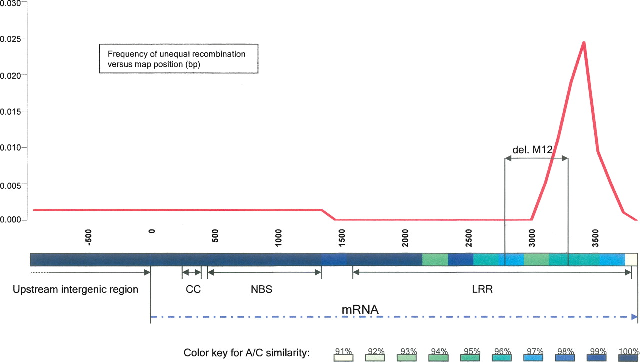 Distribution of unequal recombination events along the consensus sequence of the NBS–LRR paralogs A and C (3737 bp) and their upstream noncoding regions (870 bp). Similarity between paralogs A and C is shown using a color-coded bar below the distribution graph. Seven of the 11 A–C recombinants and the single B/C recombinant (M1–M7, M13) were localized in a highly variable segment of the LRR region. Recombination frequency in this region was significantly higher (P < 0.0005) than the overall frequency measured along the complete gene. A 468-bp internal deletion in paralog B of M12 overlaps with the A/C recombination hot-spot, suggesting that an imprecisely repaired double-strand break also occurred in the high-recombination region.