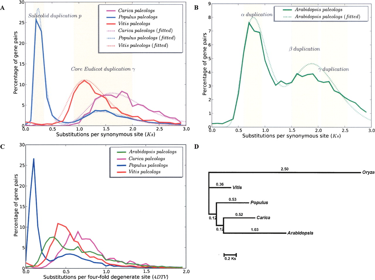 (A,B) Distribution of Ks distances among Carica, Populus, Vitis, and Arabidopsis paleologs. Ks values are grouped into bins of 0.1 intervals. Certain Ks intervals are highlighted as they correspond to several presumed whole-genome duplication events. Dotted lines are fitted mixtures of log-normal distributions for the paleolog Ks distributions (see Methods). (C) Distribution of 4DTV distance among paleologs in the same four eudicot lineages. (D) Phylogeny of single-copy ortholog set used in relative rate estimates. A total of 47 orthologous genes that are single copy in all five species were used in the analysis. Protein alignments for each ortholog group were constructed and then used to guide DNA alignments. The alignments are then concatenated, with 53,856 aligned nucleotide positions. Per-site Ks values on each branch were estimated by codeml in the PAML package (Yang 1997) using a constrained topology that reflects organismal relationships.