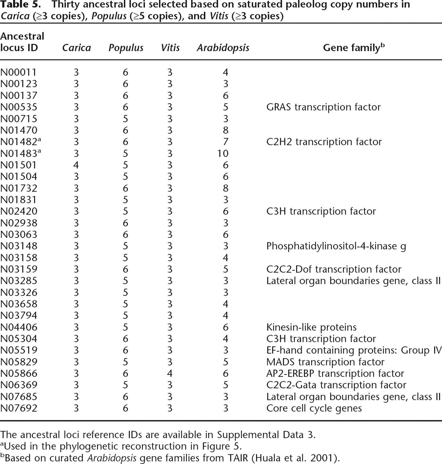 Thirty ancestral loci selected based on saturated paleolog copy numbers in Carica (≥3 copies), Populus (≥5 copies), and Vitis (≥3 copies)
