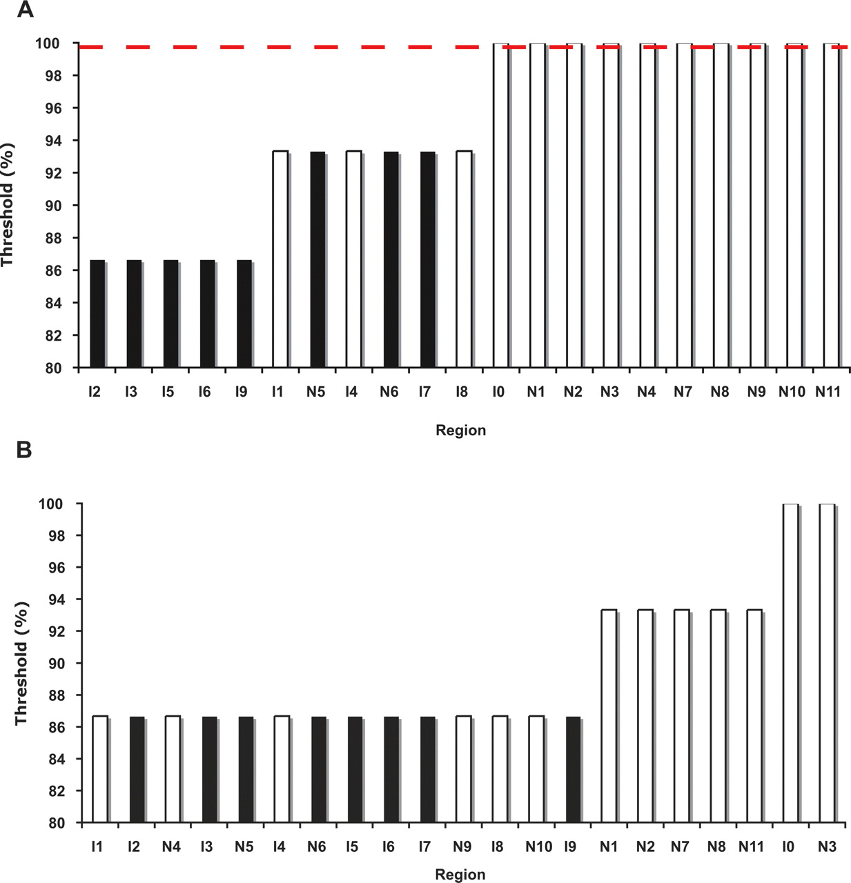 Revising MUSSA parameters for well-conserved regions. (A) A 15-bp window and four-way comparison among C. elegans, C. briggsae, C. brenneri, and C. remanei identified the thresholds at which MUSSA matches are observed within a region. Regions capable of driving expression are shown in white and those not capable of driving expression are shown in black. With a threshold of 100%, there is a 77% recovery of expressing regions with perfect specificity. (B) Using five-way comparisons and a 15-bp window among the four above species and C. sp. 3 PS1010, the thresholds where conservation was still observed were identified for each element. The predictive power for identifying functional regions is considerably reduced from the four-way comparison.