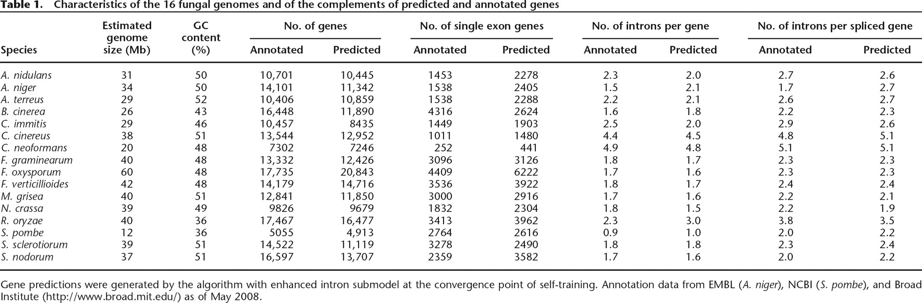 Gene predictions were generated by the algorithm with enhanced intron submodel at the convergence point of self-training. Annotation data from EMBL (A. niger), NCBI (S. pombe), and Broad Institute (http://www.broad.mit.edu/) as of May 2008.
