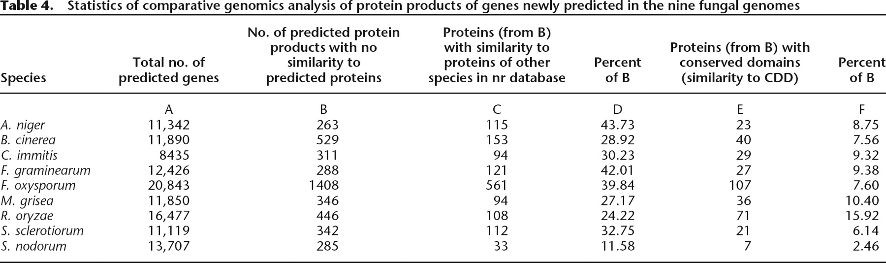 Statistics of comparative genomics analysis of protein products of genes newly predicted in the nine fungal genomes