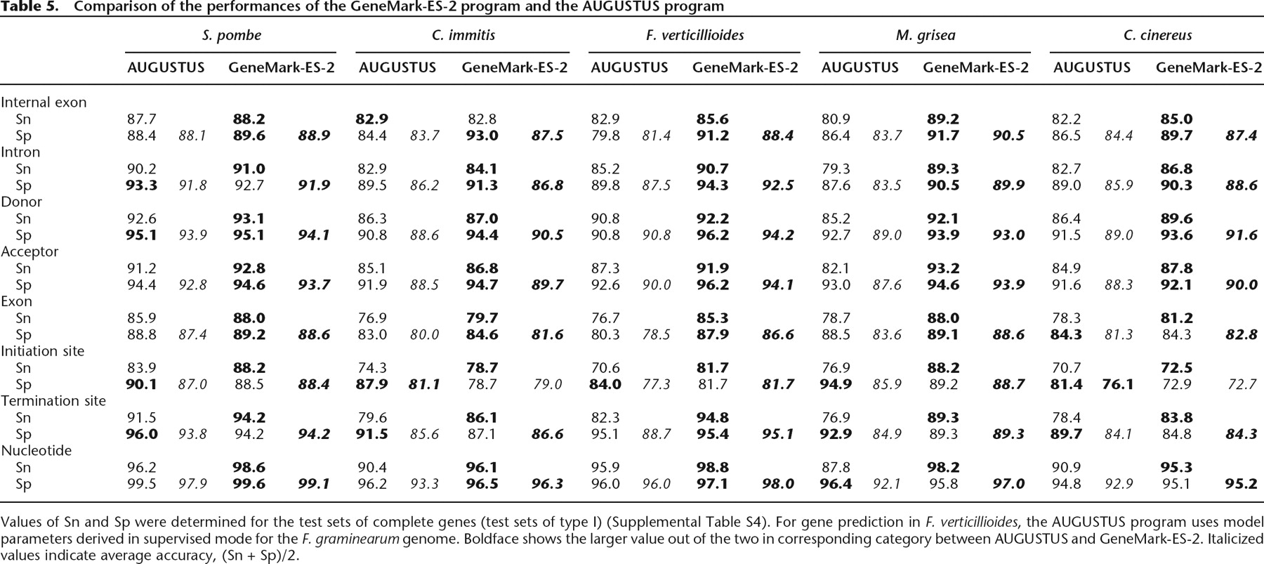 Values of Sn and Sp were determined for the test sets of complete genes (test sets of type I) (Supplemental Table S4). For gene prediction in F. verticillioides, the AUGUSTUS program uses model parameters derived in supervised mode for the F. graminearum genome. Boldface shows the larger value out of the two in corresponding category between AUGUSTUS and GeneMark-ES-2. Italicized values indicate average accuracy, (Sn + Sp)/2.