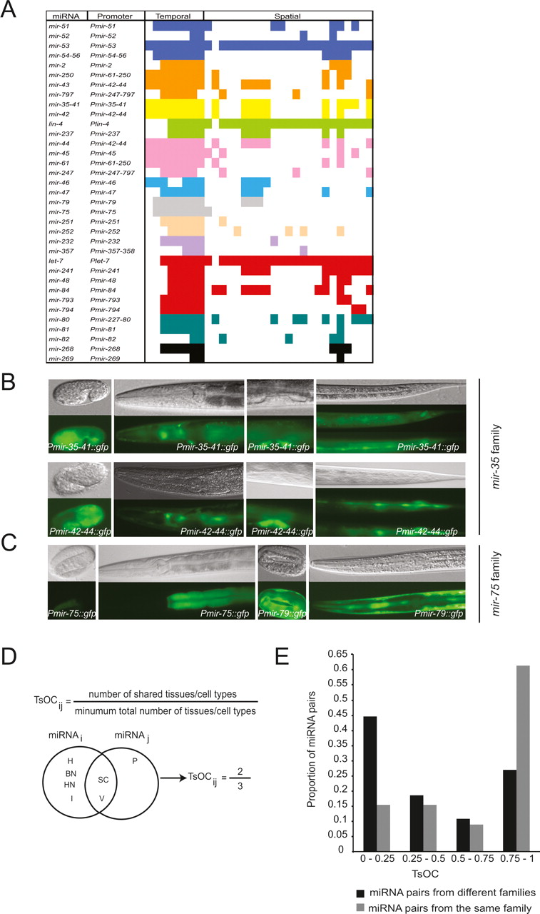 miRNAs from a given family can have overlapping as well as different spatiotemporal expression patterns. (A) Cartoon depicting expression patterns of 10 complete and two incomplete (let-7 and mir-80 families shown at the bottom) miRNA families. Each color represents a family. Spatiotemporal expression is as in Supplemental Table S3. (B) miRNAs from the mir-35 family are expressed in overlapping tissues/cell types. Pmir35-41∷gfp and Pmir-42-44∷gfp are shown. (C) miRNAs from the mir-75 family are expressed in different tissues/cell types. (Top) DIC images; (bottom) GFP fluorescence. (D) Definition and example of TsOC between any two miRNAs. (E) Distribution of TsOC among miRNA pairs from the same or different family.