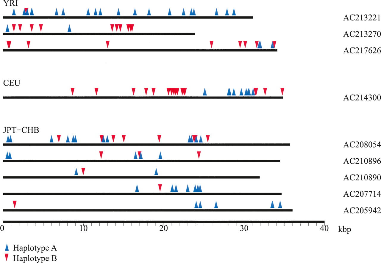 Phase-switching revealed by sequenced fosmid clones. HapMap SNP genotypes were mapped onto finished fosmid clones. Nine clones (as indicated) show patterns of inconsistent SNP phase assignments. The blue arrows correspond to SNPs assigned to haplotype A, and red arrows correspond to haplotype B. Since each clone represents a single chromosomal fragment, each sequence corresponds to a single haplotype.