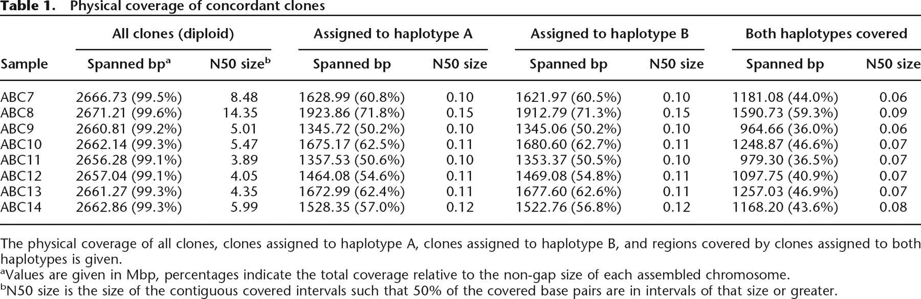 The physical coverage of all clones, clones assigned to haplotype A, clones assigned to haplotype B, and regions covered by clones assigned to both haplotypes is given.