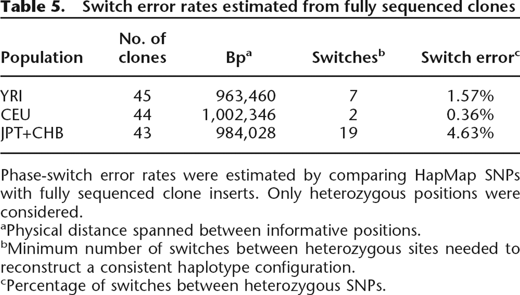 Phase-switch error rates were estimated by comparing HapMap SNPs with fully sequenced clone inserts. Only heterozygous positions were considered.