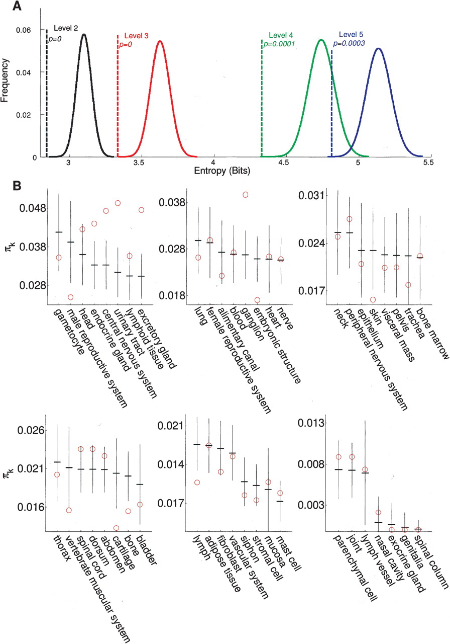 Expression patterns of genes targeted by successful drugs. (A) Distribution of Shannon entropy of gene expression for randomly sampled genes and for drug targets; the successful drug targets have significantly lower entropies of expression (higher tissue-specificity) at all four levels. See Methods for details on the tissue ontology levels. (B) Comparison of the expected proportion of drug targets per tissue under unbiased target selection conditions—(vertical solid lines) 95% confidence intervals; (dashes on the vertical lines) means—with (open circles) the actual proportion of successful drug targets per tissue. The plot indicates that there are tissues that are significantly over- and undertargeted.