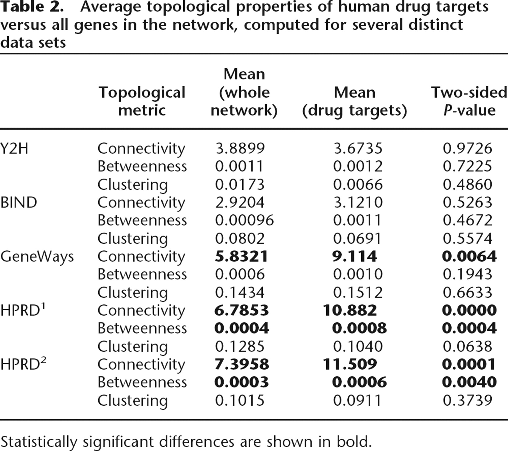 Average topological properties of human drug targets versus all genes in the network, computed for several distinct data sets