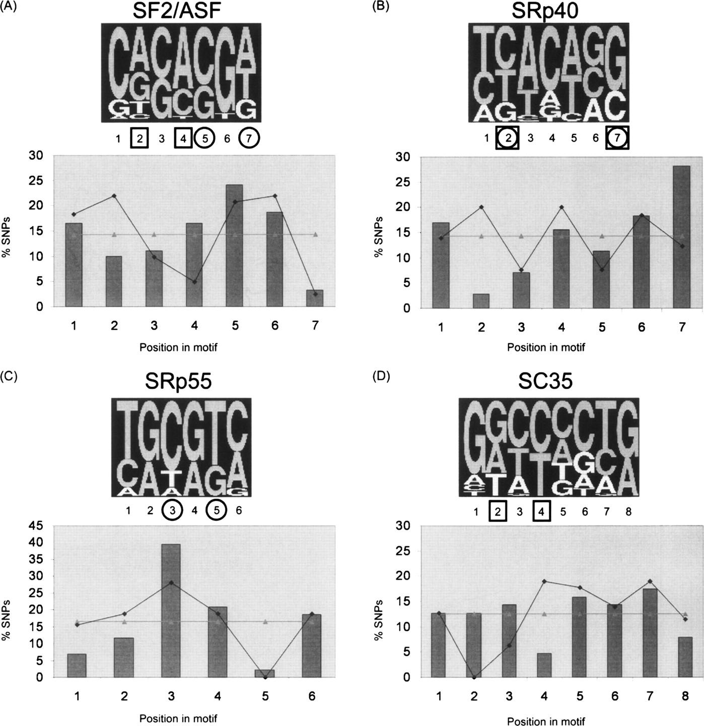 Extreme BMI synonymous SNPs are located in specific positions within ESEfinder motifs. The distribution of the synonymous extreme BMI SNPs within motifs of (A) SFRS1, (B) SFRS5, (C) SFRS6, and (D) SFRS2 is plotted. For each panel, the percentage of SNPs (Y-axis) in each position (X-axis) is indicated. For comparison, the light gray and black lines indicate the expected percentages for random data and the percentages of the rare UCSC SNPs, respectively. The pictogram was adopted from Cartegni et al. (2003) and reflects the consensus motif sequence. Positions with a significant percentage of SNPs, compared with the random data or with the rare UCSC SNPs, are marked in circles or squares, respectively.