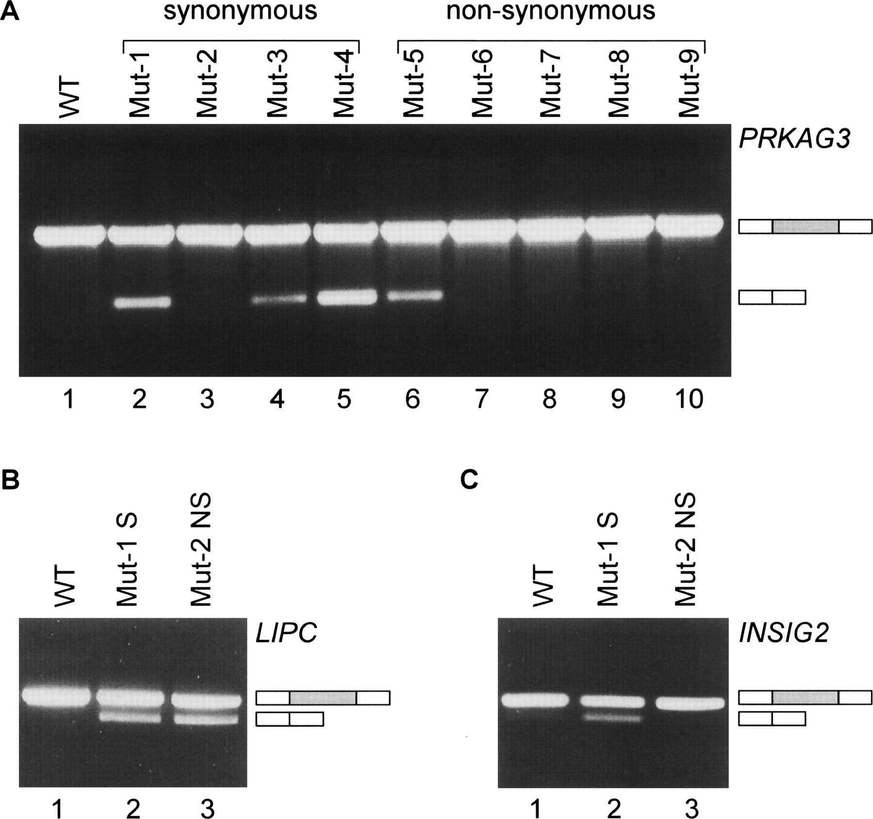 Extreme BMI SNPs affect the splicing pattern. Plasmid mutants were introduced into cells by transfection. Total cytoplasmic RNA was extracted, and splicing products were separated on a 1.5% agarose gel after reverse transcription–polymerase chain reaction (RT-PCR). (A) Lane 1, wild-type (WT) PRKAG3; lanes 2–5, synonymous mutations; lanes 6–10, nonsynonymous mutations. (B) Lane 1, WT LIPC; lane 2, synonymous mutation; lane 3, nonsynonymous mutation. (C) Lane 1, WT INSIG2; lane 2, synonymous mutation; lane 3, nonsynonymous mutation. The two minigene mRNA products are shown on the right of each panel; empty and filled boxes define constitutive and alternative exons, respectively.