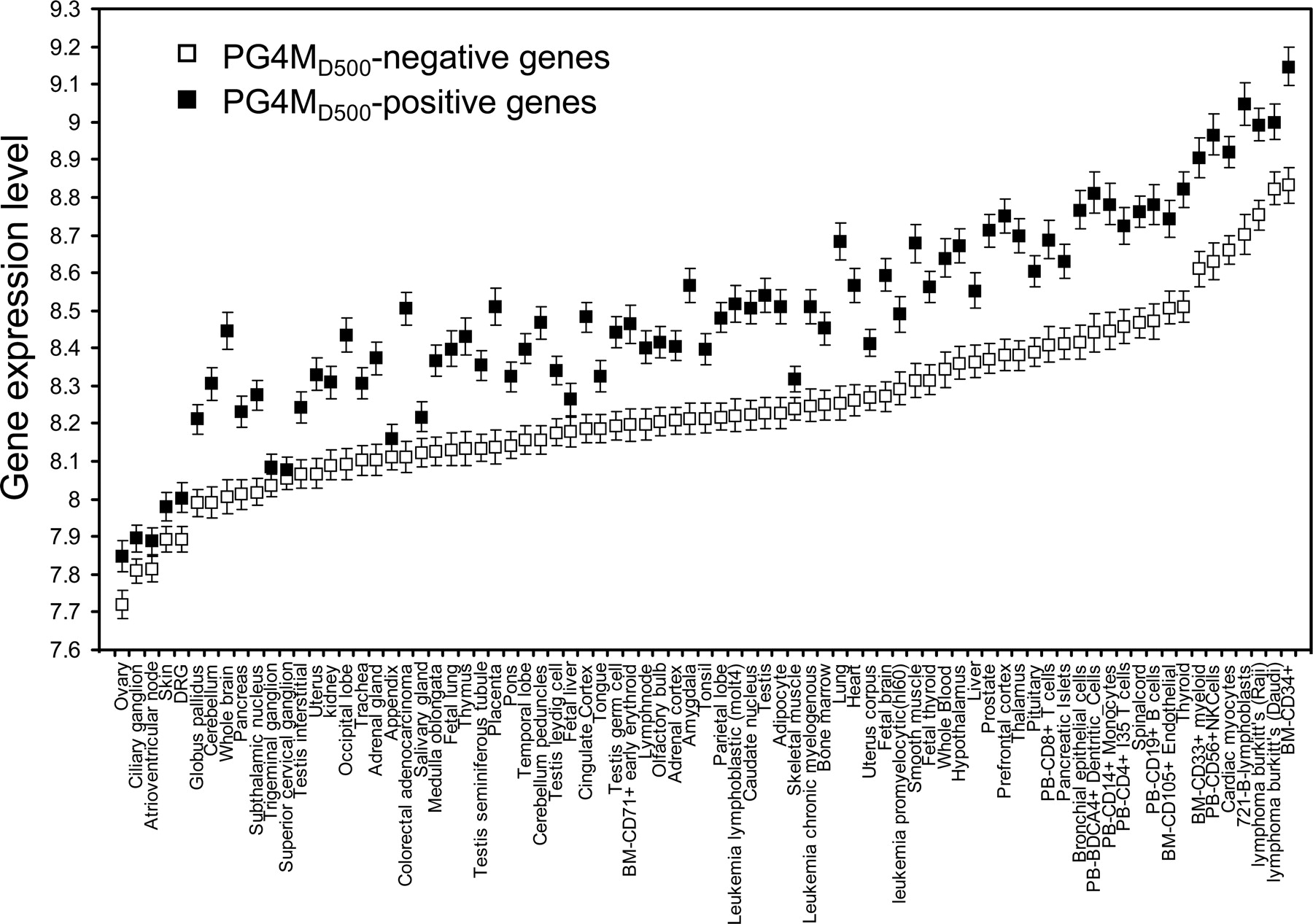 Influence of PG4MD500 on gene expression for each tissue/cell. Comparison of the gene expression levels between PG4MD500-positive (black squares) and PG4MD500-negative genes (open squares) in each human tissue/cell type. Error bars represent the 95% confidence interval of the mean expression level.