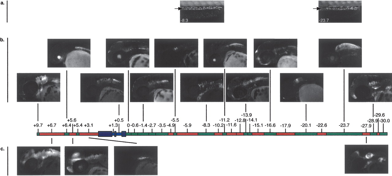 Amplicons across the phox2b display significant functional overlap. The total interval assayed is depicted by color-coded rectangles: red (ZCS), green (ZNCS), purple (phox2b exons), and blue (phox2b introns). (a,b) Images corresponding to functional ZCS constructs. (a) 72-hpf zebrafish embryos with arrow marking ENS expression (ZCS −8.3 and ZCS −23.7). (b) Images indicating the range of hindbrain expression patterns driven by ZCS constructs. (c) Images indicating the range of hindbrain expression patterns driven by ZNCS constructs.