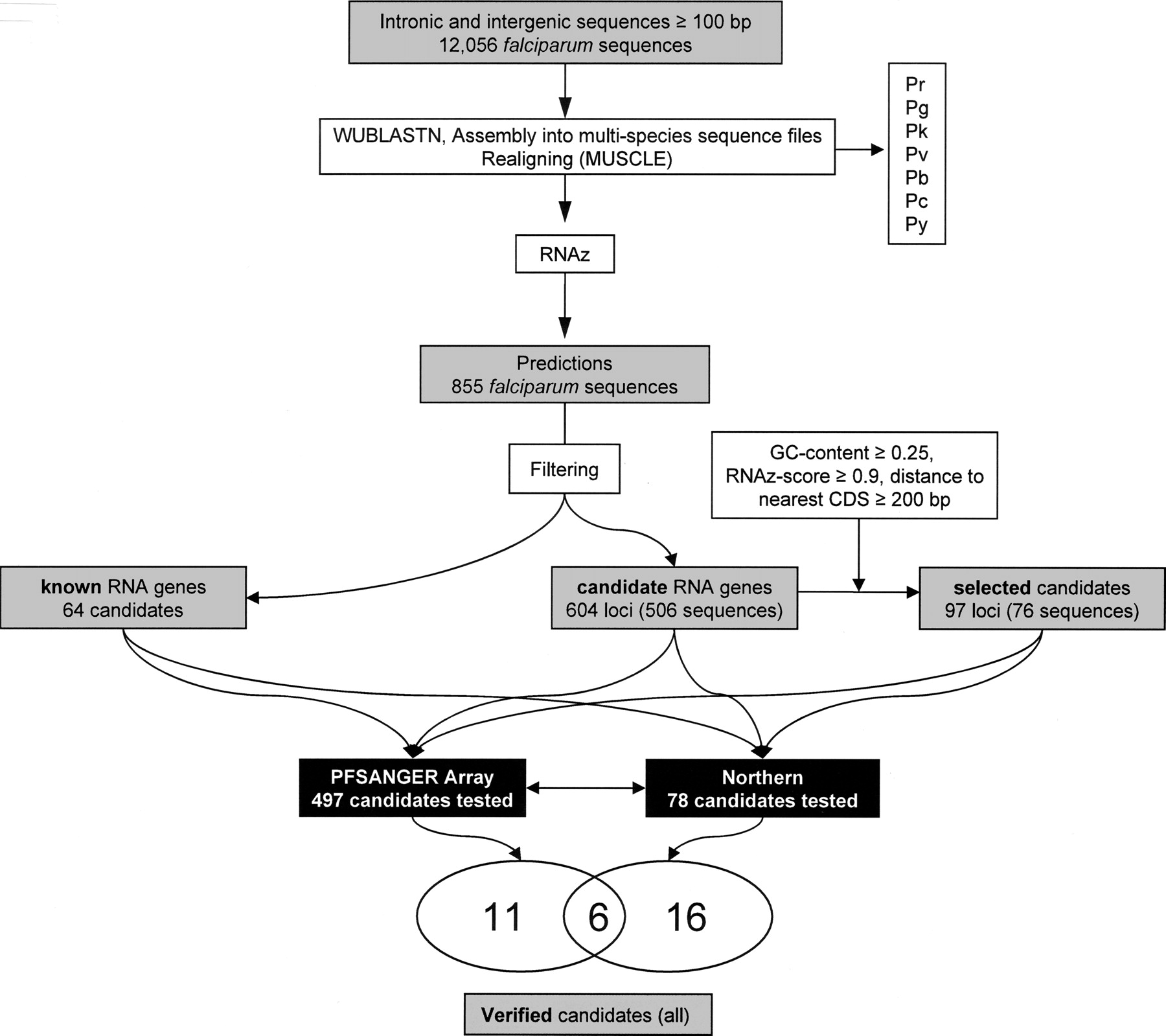 Flowchart of the prediction procedure, resulting in three classes of predictions; non-RNA predictions (non), known RNA predictions (known), and putative novel RNA predictions (candidates). Known RNA genes were identified from genome annotation and similarity to previously identified RNA genes (see in Methods). A set of candidates (selected) was chosen for Northern blotting analysis using the following criteria: (1) G+C content of the alignment >25%, (2) RNAz score ≥0.9, and (3) distance to nearest annotated protein coding gene >200 bases. Analyses and verification experiments are indicated by white boxes with black borders. Microarray indicates microarray analysis using the PFSANGER Affymetrix array; Northern, Northern blotting. (Pr indicates P. reichenowi; Pg, P. gallinaceum; Pk, P. knowlesi; Pv, P. vivax; Pb, P. berghei; Py, P. yoelii; Pc, P. chabaudi.)