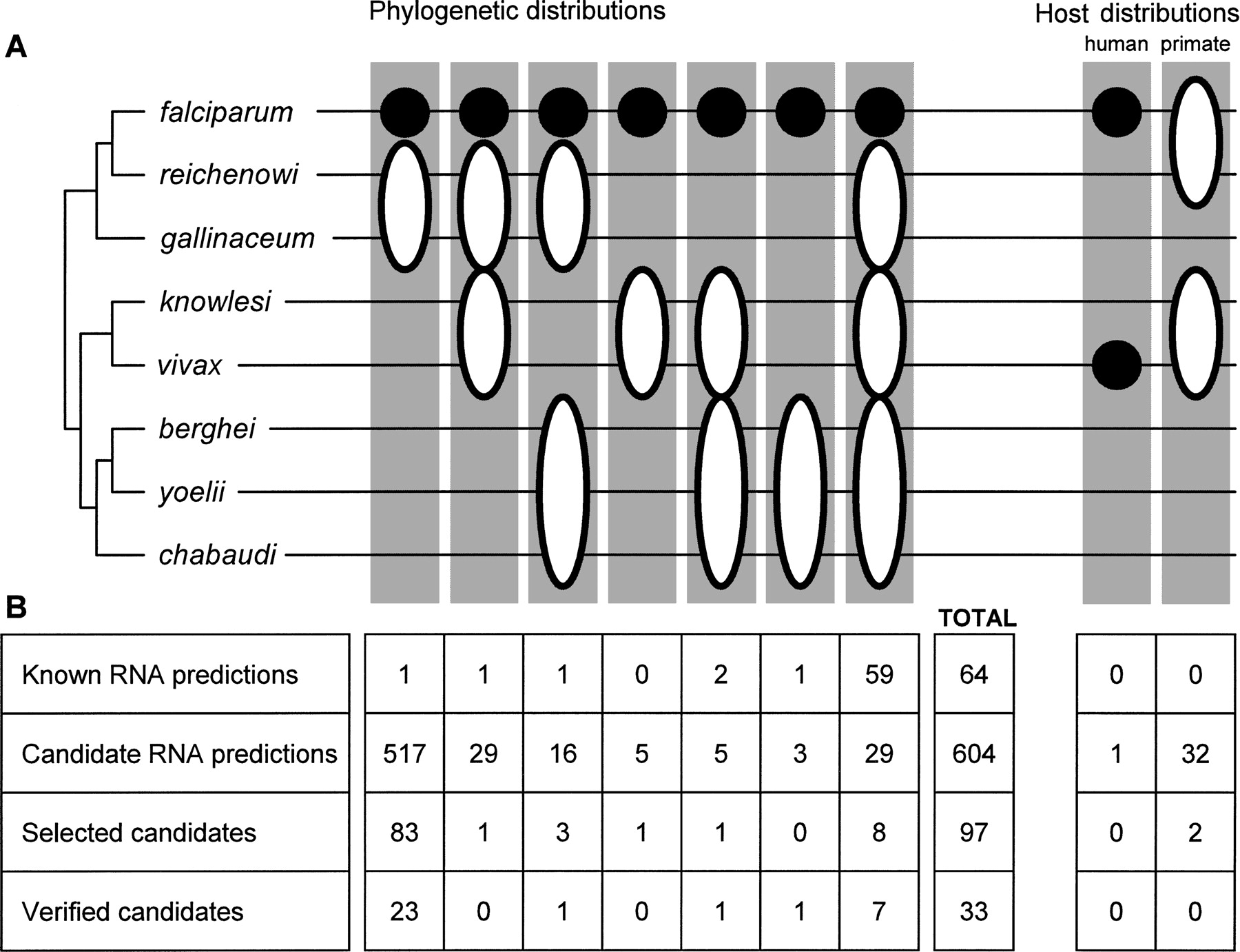 Phylogenetic distribution of predicted RNA structures. (A) A schematic Plasmodium phylogeny, based on the method of Escalante and Ayala (1994), is shown top left. Phylogenetic distribution combinations are marked in gray boxes. Black circles denote candidates found in the corresponding species. Ellipses indicate that a candidate is found in at least one of the species covered. Two phylogenetic distributions (“human” and “primate”) are functionally denoted by the host of the Plasmodium species. (B) The table indicates the number in each prediction class belonging to a given distribution.