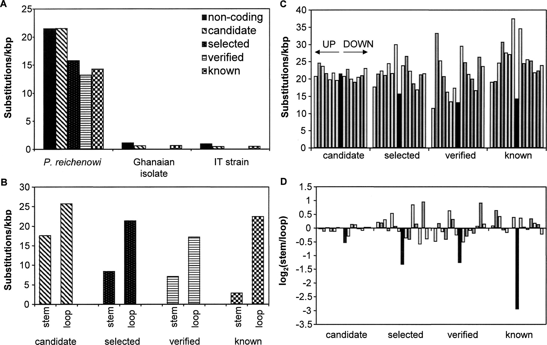 Substitution densities. (A) Density of substitutions and polymorphisms per Kbp for P. falciparum noncoding DNA within the different classes of predictions. Densities are shown for three different alignments; P. falciparum Clone 3D7 against P.f. Ghanaian clinical isolate, P.f. IT strain and P. reichenowi. (B) Each base within each locus was classified as either stem (predicted to form base pairs) or loop (predicted not to form base pairs). Prediction classes as in A. (C) Substitution densities by prediction class (as in A; black bars). Each class of prediction is preceded by virtual predictions translocated to a position of 3000, 2000, 1500, 1000, 750, 500, and 250 bp upstream (based on genomic coordinates, regardless of orientation of prediction), respectively, and succeeded by virtual predictions translocated to similar distances downstream (gray bars). (D) Log(2) ratios of substitution density between STEM and LOOP positions (as defined in B). Black bars denote real candidates, gray bars translocations as described in C.