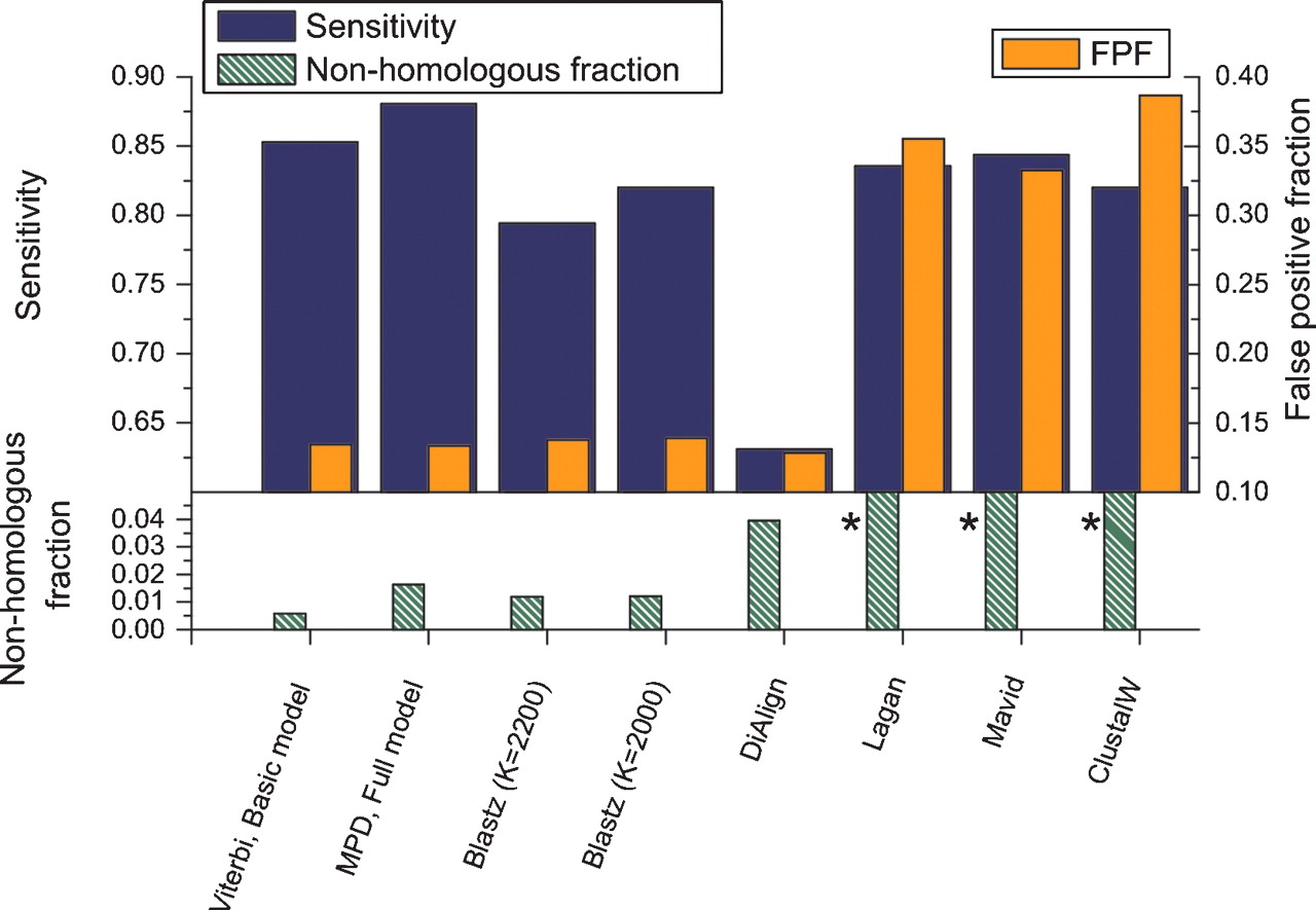 Performance comparison of score-based aligners. Histogram bars show sensitivity (black; top left axis), false-positive fraction (gray, right axis) and nonhomologous fraction (striped, bottom left axis), for simulated sequence based on human–mouse evolutionary parameters. The results for two probabilistic aligners (leftmost two sets) are included for comparison. Histogram bars marked by asterisks are off the scale; nonhomologous fraction for Lagan, 0.212; Mavid, 0.201; ClustalW, 0.223. Note that the axes in Figure 6 have different scales.