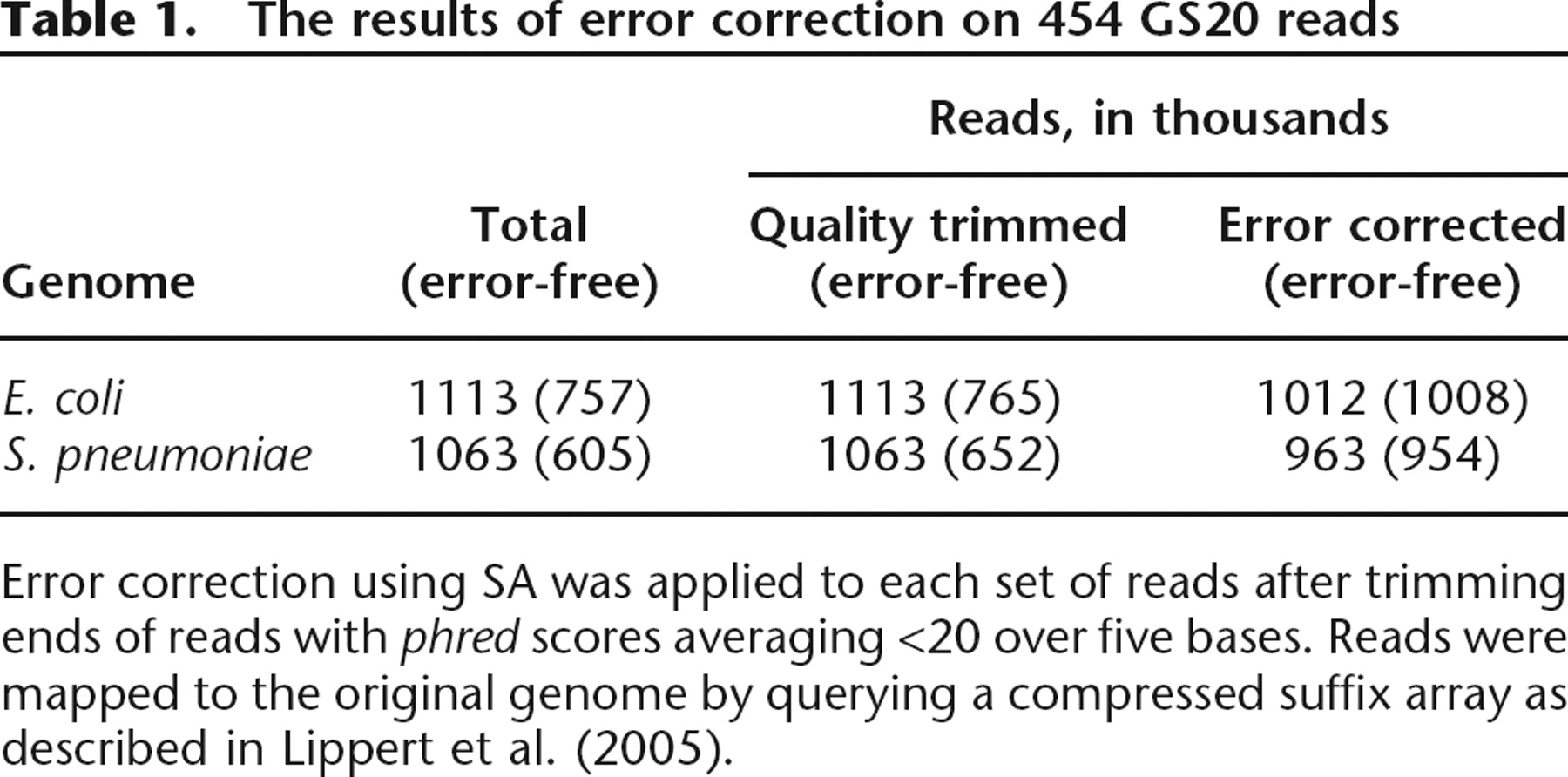 Error correction using SA was applied to each set of reads after trimming ends of reads with phred scores averaging <20 over five bases. Reads were mapped to the original genome by querying a compressed suffix array as described in Lippert et al. (2005).