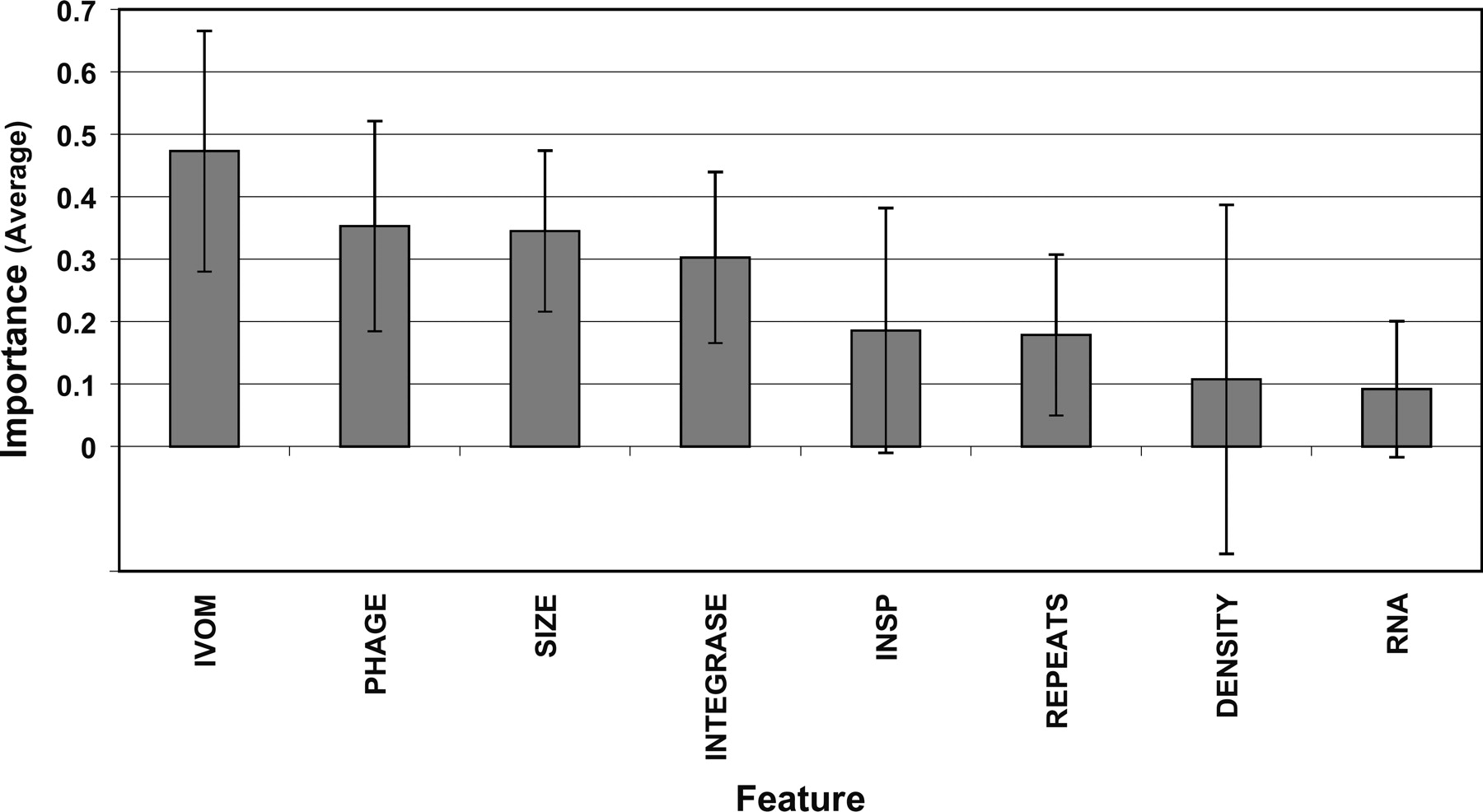 Bar chart illustrating the average “importance,” across 11 structural GI models, of the eight structural features evaluated in this analysis. The eight features have been sorted (in decreasing order) based on their average importance. Error bars show ±1 SD.