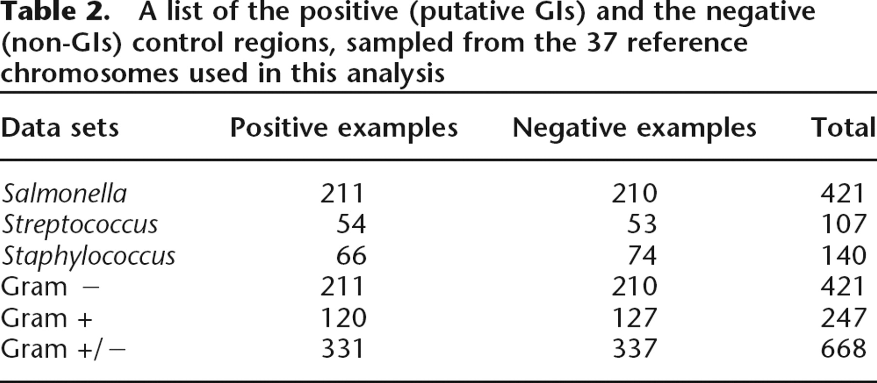 A list of the positive (putative GIs) and the negative (non-GIs) control regions, sampled from the 37 reference chromosomes used in this analysis