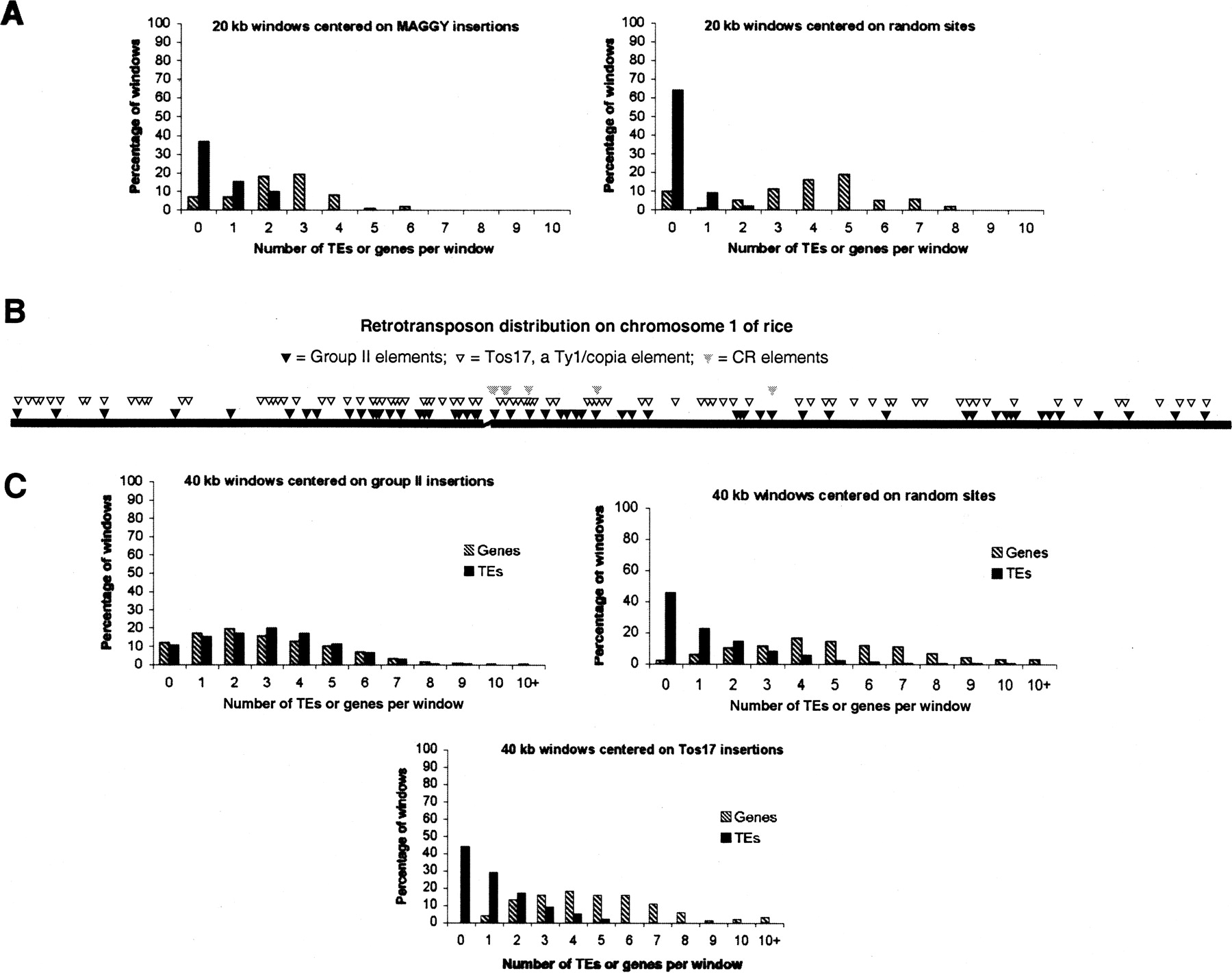 Retrotransposons with CHDs and CR motifs are preferentially located in gene-poor, transposon-rich regions of their host genomes. (A) The genomic distribution of M. grisea MAGGY (group I) insertions. For each of the 75 MAGGY insertions in the completed genome sequence (Dean et al. 2005), 20-kb windows at the site of insertion (10 kb upstream and downstream) were surveyed for genes and transposable elements. Seventy-five randomly selected sites were similarly surveyed as a control. (B) The distribution of group II, CR, and Tos17 insertions on chromosome 1 of O. sativa. Insertions of group II chromoviruses and Tos17 are distributed along the chromosome arms; however, as indicated in C below, these two element families occupy different genomic contexts. Only a few CR elements are found in the assembled rice genome sequence and these are near the pericentromeric regions (gap in chromosome). Many other CR insertions have been revealed by FISH analysis or are present in the recent sequence of the centromere from chromosome 8 (Cheng et al. 2002; Nagaki et al. 2004). (C) Os (class II) insertions are in transposon-rich, gene-poor regions scattered across the 12 rice chromosomes. For each Os insertion site, a 40-kb window (20 kb upstream and 20 kb downstream) was surveyed for genes and transposable elements. Windows containing Os insertions have more transposable elements and fewer genes than random windows or windows centered on Tos17 insertions, a retrotransposon that integrates preferentially into gene-rich regions of the rice genome (Miyao et al. 2003).