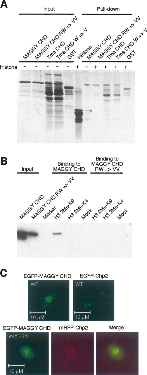 The MAGGY CHD recognizes histone H3 methyl-K9. (A) MAGGY CHD interacts with histone H3. GST-MAGGY CHD and GST-Tma CHD fusion proteins were mixed with a calf thymus histone extract and then pulled down using glutathione agarose beads. Both the input and pull-down reactions were separated by SDS-PAGE and visualized by SYPRO Ruby protein gel stain. H3, as indicated by the asterisk, was enriched in the pull-down with the MAGGY CHD. No interaction was observed with the MAGGY CHD RW mutation or with wild-type or mutant variants of the Tma CHD. (B) The MAGGY CHD specifically interacts with H3 dimethyl-K9. Biotin-labeled histone peptides were incubated with His6-tagged MAGGY CHD, and then pulled-down with streptavidin agarose beads. Pull-down reactions were separated by SDS-PAGE and transferred to nylon membranes. The presence of the CHD was detected using an anti-His6 antibody. The MAGGY CHD specifically interacts with histone H3 dimethyl-K9, and not with H3 dimethyl-K4. Mutations in conserved residues of the CHD abrogate the interaction. (C) MAGGY CHD localizes to sites of H3 methyl-K9 in S. pombe. The MAGGY CHD localizes to punctate sites within the nucleus as does Chp2, a CHD protein found at sites of centromeric heterochromatin in S. pombe (Sadaie et al. 2004) (top). Colocalization of the MAGGY CHD and Chp2 is observed in a swi6-115 strain, which lacks the S. pombe HP1 homolog (Nakagawa et al. 2002). The swi6-115 strain should allow expression of genes in centromeric heterochromatin and was used in transposition assays that require expression of a marker gene carried by Tf1 (see Fig. 4).
