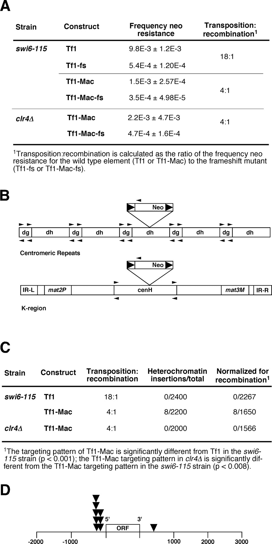 Target site choice of the Tf1 retrotransposon in S. pombe is altered by adding the MAGGY CHD to integrase. (A) Transposition and cDNA recombination frequencies of Tf1 and Tf1-Mac. The MAGGY CHD was fused to the C terminus of Tf1 integrase, creating Tf1-Mac. Tf1-Mac transposes, but at a lower frequency than wild-type Tf1. Integrase frameshift mutants (Tf1-fs and Tf1-Mac-fs) abolish Tf1 or Tf1-Mac integration, and therefore serve to infer frequencies of cDNA recombination. (B) A screen for insertions of Tf1 and Tf1-Mac in heterochromatin. A diagram of S. pombe centromeric repeats and mating type region depicting the location of the PCR primers used to identify heterochromatic Tf1 insertions. (C) Targeting of Tf1-Mac to heterochromatin. Centromeric heterochromatin in S. pombe, which is enriched in histone H3 methyl-K9, becomes a target site for Tf1-Mac in the swi6-115 strain. In the swi6-115 strain, there are eight integration events into heterochromatin out of 2200 Tf1-Mac transposition events. This number of transposition events includes elements incorporated into the genome by either integration or recombination. The number that arose specifically by integration was inferred by normalizing the data using the value for the ratio of transposition to recombination (4:1). The normalized heterochromatin targeting frequency is eight out of 1650 integration events. Tf1-Mac does not target into heterochromatin in the clr4Δ strain, which lacks H3 methyl-K9. (D) Native Tf1 target specificity is retained by the Tf1-Mac construct. Fusion of the MAGGY CHD to Tf1 does not abolish Tf1’s native targeting specificity in the swi6-115 strain. Sites of insertion for nine randomly selected Tf1 integration events were determined by inverse PCR. Eight were found within promoters and one near a transcription terminator, consistent with previously documented Tf1 targeting patterns (Behrens et al. 2000; Singleton and Levin 2002).