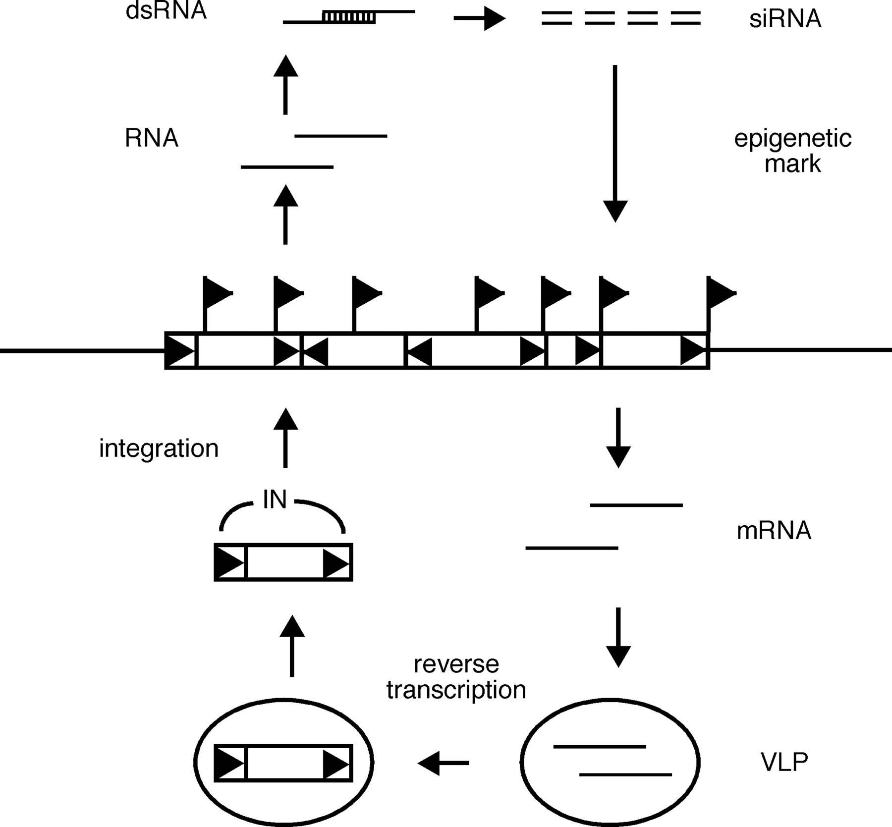 Self-perpetuating model for heterochromatin expansion. Repetitive elements such as retrotransposons produce dsRNAs that trigger the RNAi pathway. This results in the targeting of DNA and histone methyltransferases to retrotransposons resident on host chromosomes. Histone modification (e.g., H3 methyl-K9) establishes heterochromatin and, in turn, creates recognition sites for retrotransposon integrases. The targeting of retrotransposons to the domain of heterochromatin serves to reinforce the epigenetic mark.