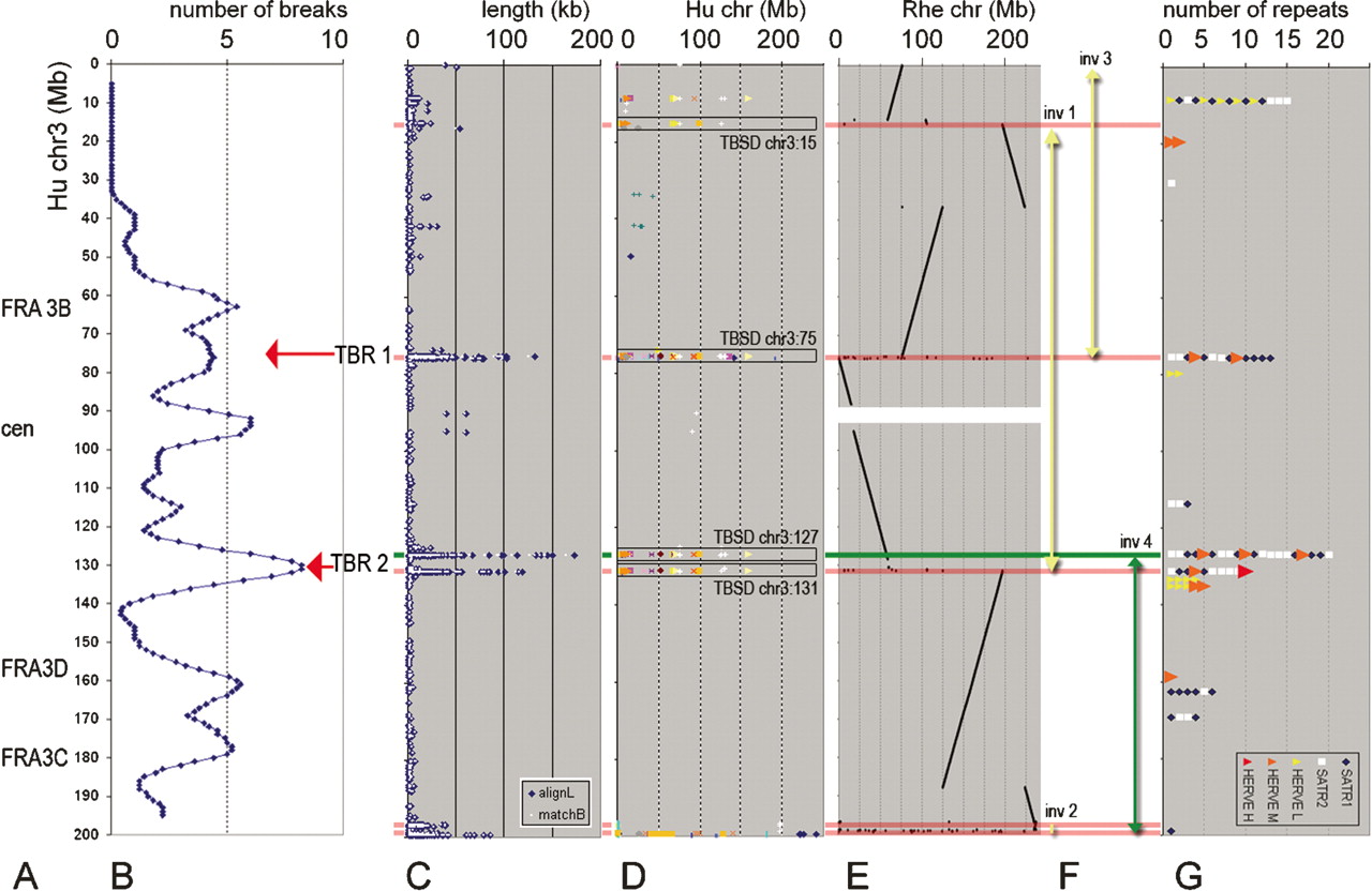 Distribution of chr 3 features from 3-pter (top, 0 Mb) to 3-qter (bottom, 200 Mb). Megabase position is shown on vertical scale. (A) Approximate positions of known instability regions, including fragile sites FRA3B, FRA3C, and FRA3D (Schwartz et al. 2006) and pericentromeric region (cen). (B) Cumulative profile for 54 break regions detected by mpFISH in 10 carcinoma cell lines (for explanations, see Supplemental Fig. 6). Red arrows show newly identified tumor break-prone regions (TBRs). (C) SDs of different lengths. Blue rhomb (“alignL”), length of aligned duplicated sequence; white spot (“matchB”), number of match-pairs in aligned unit. (D) Dot-plot alignment of the duplicated (>90% homology) sequences longer than 10 kb, to different human chromosomes (shown with different colors) in relation to their megabase position on a chromosome (horizontal axis). (E) Dot-plot alignment of the rhesus orthologous sequences in relation to their megabase position on chromosome (horizontal axis). The human–rhesus synteny breaks, which correspond to human branch evolution, are shown by red horizontal lines. The human–mouse synteny break, which corresponds to a chromosome rearrangement during early primate evolution, is shown by a green horizontal line. (F) Four inversions in human chr 3 evolution: three occurred after divergence from rhesus branch (yellow arrows), the fourth after divergence from mouse (green arrow). (G) SATR1 and SATR2 satellite repeats, flanking the moderate score HERVE element (HERVE M) are associated with the TBRs, long SDs, and evolutionary chr 3 breaks. HERVE L and HERVE H: low and high score HERVE elements, respectively. Horizontal axis: number of the repeat elements within a particular site.