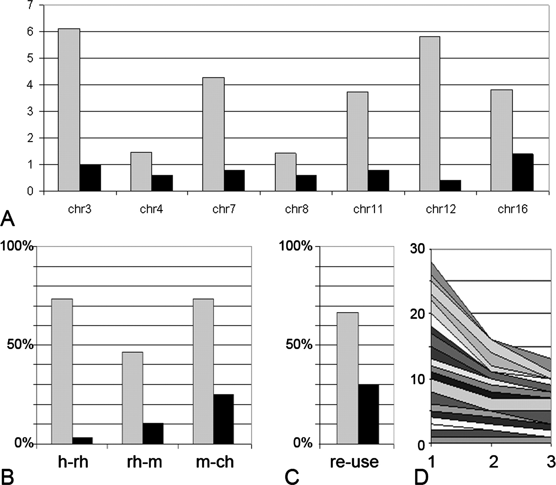 Frequencies of breaks within regions surrounding the TBSDs during mammalian evolution. (A) Total number of human–rhesus, rhesus–mouse, and mouse–chicken synteny breaks per megabase within regions surrounding the TBSDs (gray) and within random 500-kb sites (black) taken from each 10 Mb of the particular chromosome (chr 3, chr 4, etc) sequence. (B) Percentage of regions, which had human–rhesus (h-rh), rhesus–mouse (rh-m), and mouse–chicken (m-ch) synteny breaks, counted from total number of analyzed 500-kb regions, which surrounded either TBSDs (gray) or random sites taken at each 10 Mb of TBSD containing chromosome sequences (black). (C) Frequency of reuse for synteny breakpoint region at TBSD (gray) and at random synteny break (black). Synteny breakpoint region is defined as a 500-kb region containing a minimum of one break in either human–rhesus or in rhesus–mouse or in mouse–chicken branch. Reuse of the synteny breakpoint region is defined as the occurrence of breaks in at least two of three mentioned branches during evolution. (D) Gradual decrease in frequency of rhesus–mouse and mouse–chicken synteny breaks with increase of distance from TBSD sites. Cumulative area shows the number of breaks within the 1st, 2nd, and 3rd sequence windows (point 1, 2, and 3, respectively) from different TBSD locations. For each TBSD location, windows 1, 2, and 3 represent successive sequence windows equal in size to TBSD, which flank TBSD (1), located next to both flanks (2), and most distant windows (3).