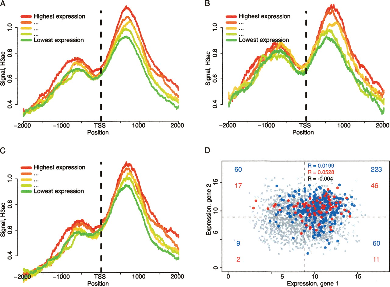 Positive correlation between H3ac downstream of PCG TSS and expression levels. (A) H3ac profiles of PCGs divided in five equal numbered groups based on their expression levels. All PCGs bound by H3ac within 1 kb of their TSS and where expression data were available were considered. Similar H3ac profiles when separating the PCGs above in bidirectional (PCG+PCG or human mRNA) (B) or unidirectional (C). (D) PCGs bound by H3ac (blue) or USF1 (red) within 1 kb of their TSS, found in non-overlapping bidirectional conformation and with available expression data for the two PCGs involved in each bidirectional pair were considered; 1500 pairs of PCG were randomly sampled, and their expression levels were similarly represented (gray). The dotted lines indicate the average level of expression for the randomly sampled PCGs. Pearson correlation (R) values for USF1, H3ac, and randomly sampled data sets expression levels are in the upper right corner. The expression data was log2 transformed.