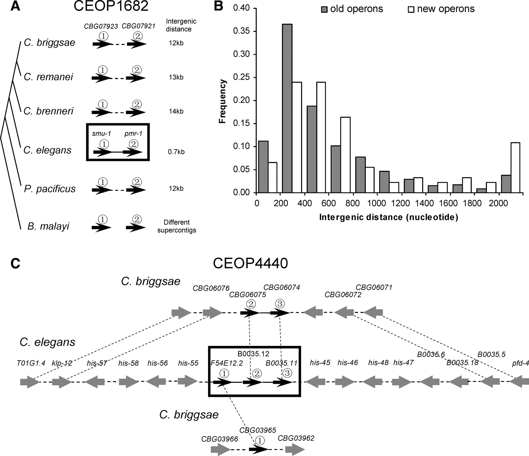 Mechanisms of operon gains. Black arrows stand for genes belonging to operons in C. elegans or their orthologs in other species, with the circled numbers above the arrows showing the order of the genes in the C. elegans operon. Gray arrows show other genes. In C. elegans, horizontal solid lines link genes belonging to the same operon (boxed) and horizontal dash lines link genes not belonging to the same operon. In other species, genes inferred to be in the same operons are linked by horizontal solid lines; otherwise, they are linked by horizontal dash lines. Dotted lines show orthologous relationship between genes. In C. elegans, Caenorhabditis Genetics Center (CGC), names or sequence names are shown above the gene model, while in other species, the names are shown if they exist in WormBase release WS182. (A) Formation of a new operon in C. elegans. (B) Comparison of intergenic distances between old operons and new operons. New operons are those formed after the divergence between C. elegans and C. briggsae, while old operons are those formed before that divergence. (C) Expansion of an existing operon by addition of F54E12.2 as the first gene in CEOP4440 in the C. elegans lineage.