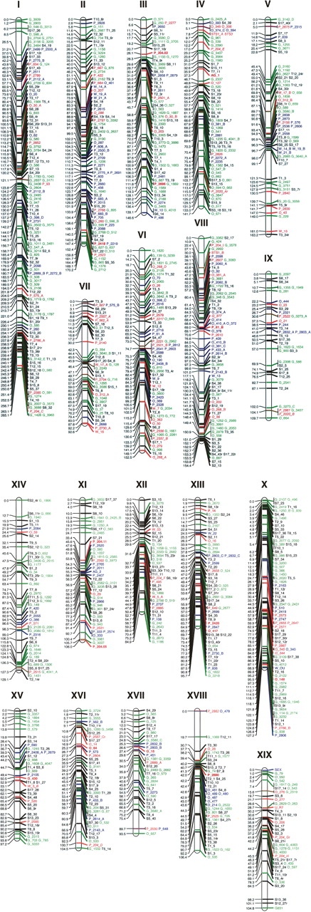 The consensus genetic map for Populus. (Black) AFLP markers; (red) the framework SSR markers in Family 13 and Family 331; (green) the alternative SSR markers genotyped in Family 13; (blue) the alternative SSR markers genotyped in Family 331; (SEX) the gender determination locus. The markers in bins have the same consensus position. The consensus map was established from genotypes of different pedigrees, and thus, the genetic distance does not reflect the recombination rate between markers but rather only marker orders on the consensus map. Note SSR primers were developed from different sequence data (for marker nomenclature, see text).