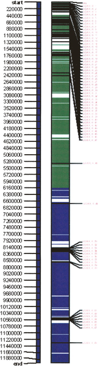 Forty-seven NBS-LRR genes localize to a 2.45-Mb region at the peritelomeric end of chromosome XIX. The physical length is estimated by the assembled sequence scaffold lengths plus the averaged gap length among scaffolds. The green portion of the vertical bar indicates the distorted region; the blue portion indicates the nondistorted region; the white portion indicates sequence gaps; the horizontal black bars show the physical positions of NBS-LRR genes; and the red letters are the serial number of NBS-LRR genes based on their physical orders along the chromosome. The ruler to the left of the chromosomal bar indicates the physical length in base pairs. Only one NBS-LRR gene would be expected in the corresponding 2.45-Mb region based on a uniform average genome-wide distribution assumption.