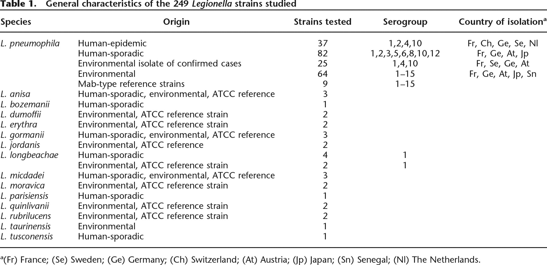 General characteristics of the 249 Legionella strains studied