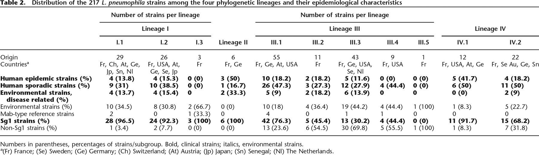 Distribution of the 217 L. pneumophila strains among the four phylogenetic lineages and their epidemiological characteristics