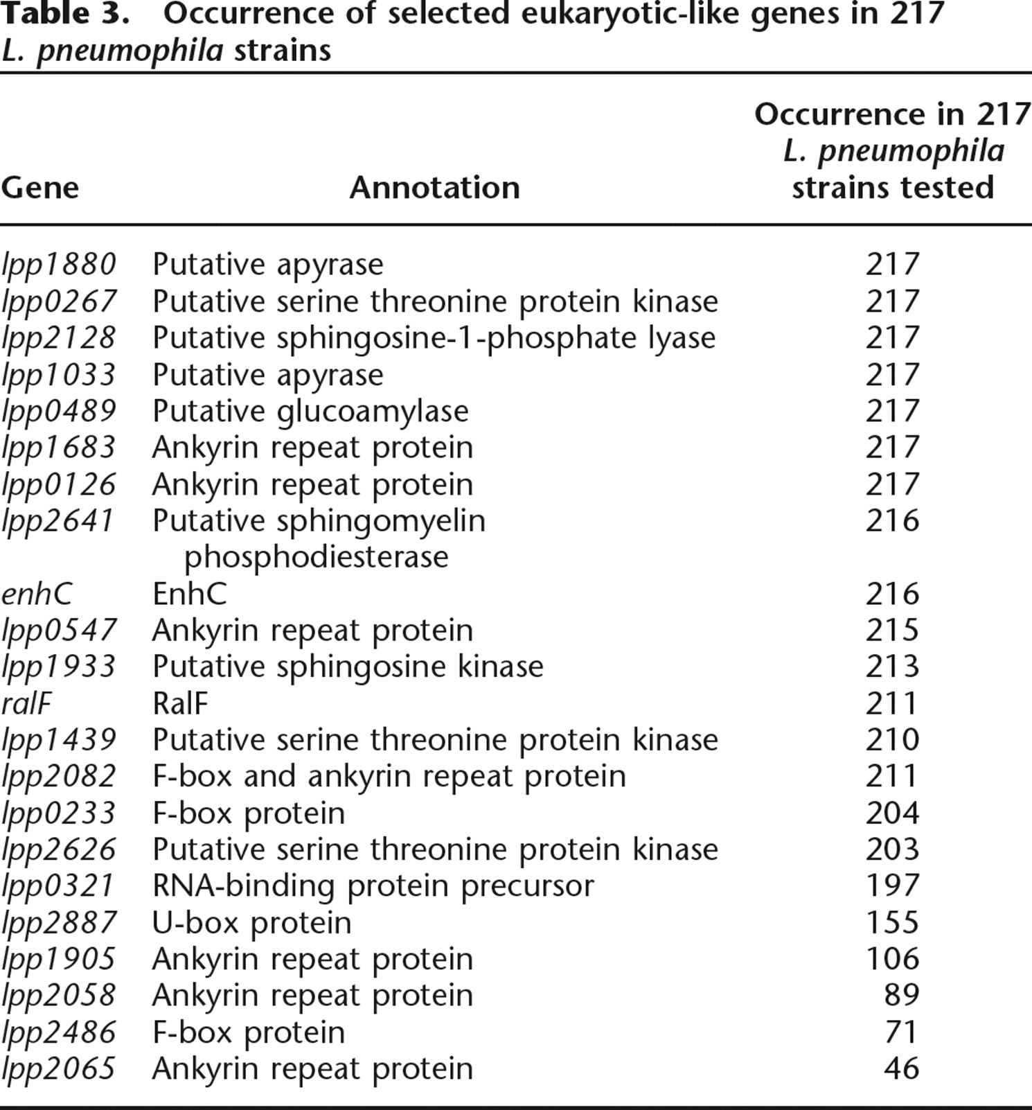 Occurrence of selected eukaryotic-like genes in 217 L. pneumophila strains