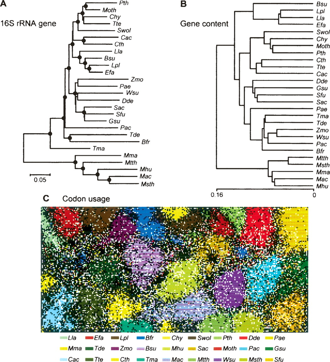 Evolutionary relationships among the organisms analyzed in this study. (A) A neighbor-joining tree based on 16S rRNA gene sequences. (Black circles) Branch nodes supported by the Bootstrap analysis (>70%). (B) A UPGMA tree based on gene contents. (C) A self-organization map (SOM) based on codon usages. Each point represents one CDS, and CDSs of one organism are presented with the same color. Italic letters indicate organism names; (Chy) Carboxydothermus hydrogenoformans; (Lla) Lactococcus lactis; (Lpl) Lactobacillus plantarum; (Efa) Enterococcus faecalis; (Bsu) Bacillus subtilis; (Wsu) Wolinella succinogenes; (Dde) Desulfovibrio desulfuricans; (Gsu) Geobacter sulfurreducens; (Zmo) Zymomonas mobilis; (Pae) Pseudomonas aeruginosa; (Tma) Thermotoga maritima. Refer to the legend of Figure 1 for other organisms and to Supplemental Table S1 for more information about these organisms.