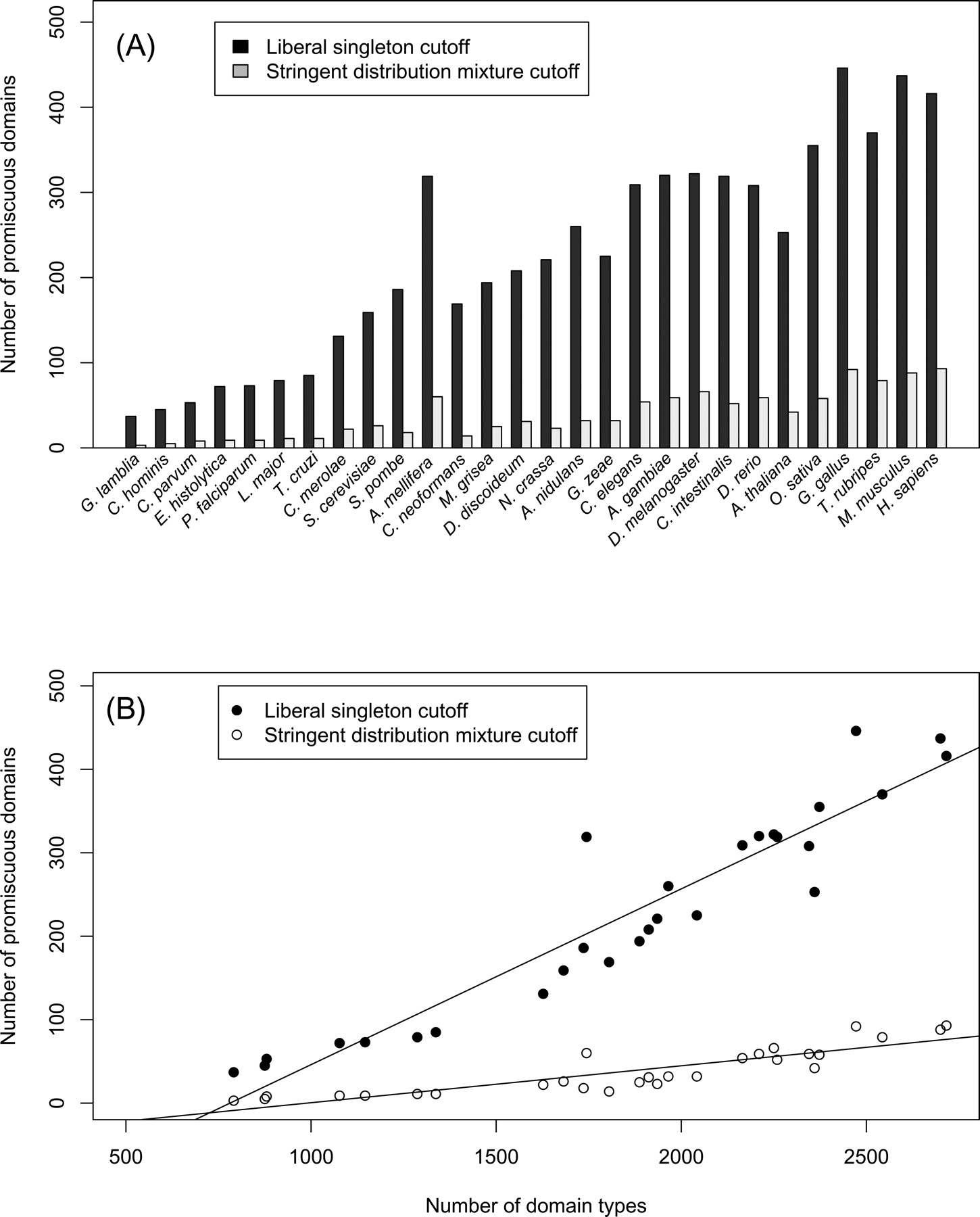 Distribution of promiscuous domains in eukaryotes. (A) Promiscuous domains in the analyzed eukaryotic species. (Black bars) Promiscuous domains defined using weighted bigram frequency with the cutoff determined by the liberal singleton method; (gray bars) promiscuous domains defined using the strict distribution mixture criterion (see text for details). (B) The number of promiscuous domains (on the Y-axis) increases with the number of unique domain types (on the X-axis). (Black circles) Promiscuous domains determined by the liberal singleton cutoff method (Pearson’s correlation 0.94, P-value 4.4 × 10−14); (empty circles) promiscuous domains determined with the strict distribution mixture criterion (Pearson’s correlation 0.88, P-value 4.6 × 10−10).