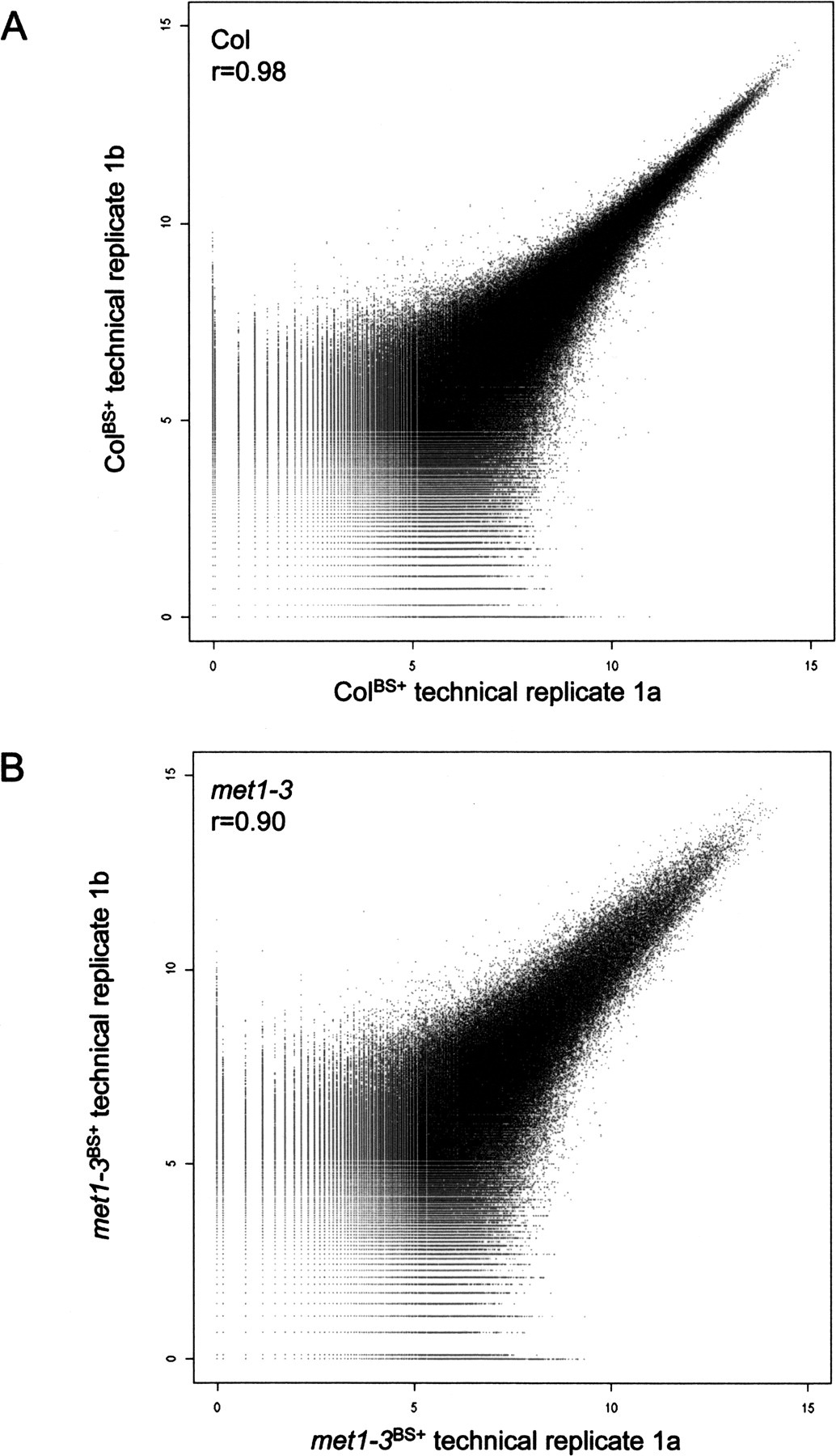Assessment of the technical reproducibility observed for the BiMP technology. A scatter plot comparison of two technically replicated hybridization datasets (one hybridization per axis) with all signal intensities presented (>3.2 × 106 probe pairs, log2 scale). From one bisulfite-converted sample, two DNA aliquots (100 ng) were independently amplified, fragmented, labeled, and hybridized (see Methods). The correlation coefficient (r) was calculated using TAS (Affymetrix), and the plot was drawn in the R statistical environment (http://www.r-project.org). (A) Col bisulfite-converted DNA, (B) met1-3 bisulfite-converted DNA.