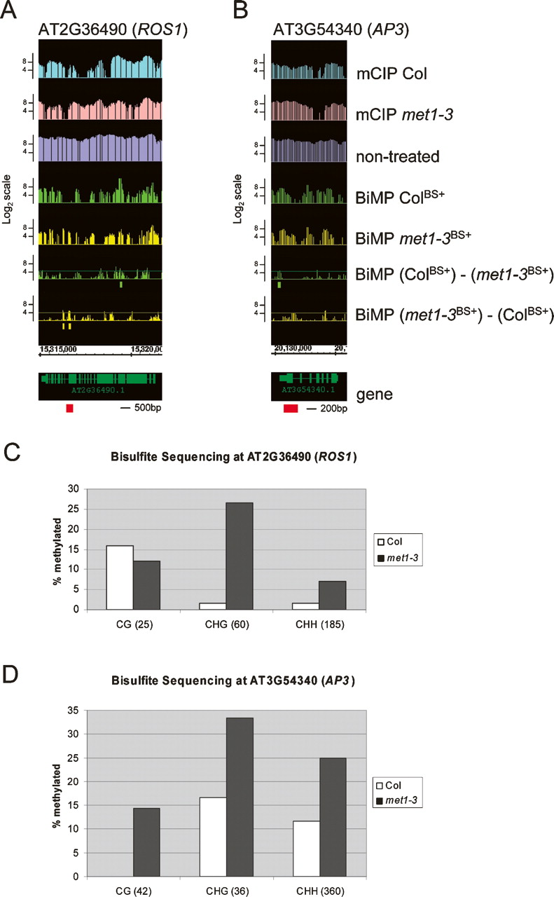 Validation of novel methylation polymorphisms detected using BiMP. Graphs were prepared as in Fig. 3B. (A) AT2G36490 (ROS1), (B) AT3G54340 (AP3). (Red boxes) Regions that were bisulfite sequenced. (C,D) Bisulfite sequencing at the AT2G36490 (ROS1) (C) and AT3G54340 (AP3) (D) loci. The DNA methylation level (% methylated, Y-axis) was determined by bisulfite sequencing and presented for each different sequence motif: CG, CNG, and CHH (H = A, T, C) (see Methods). The total number of cytosines analyzed per sequence motif is provided within the parentheses.