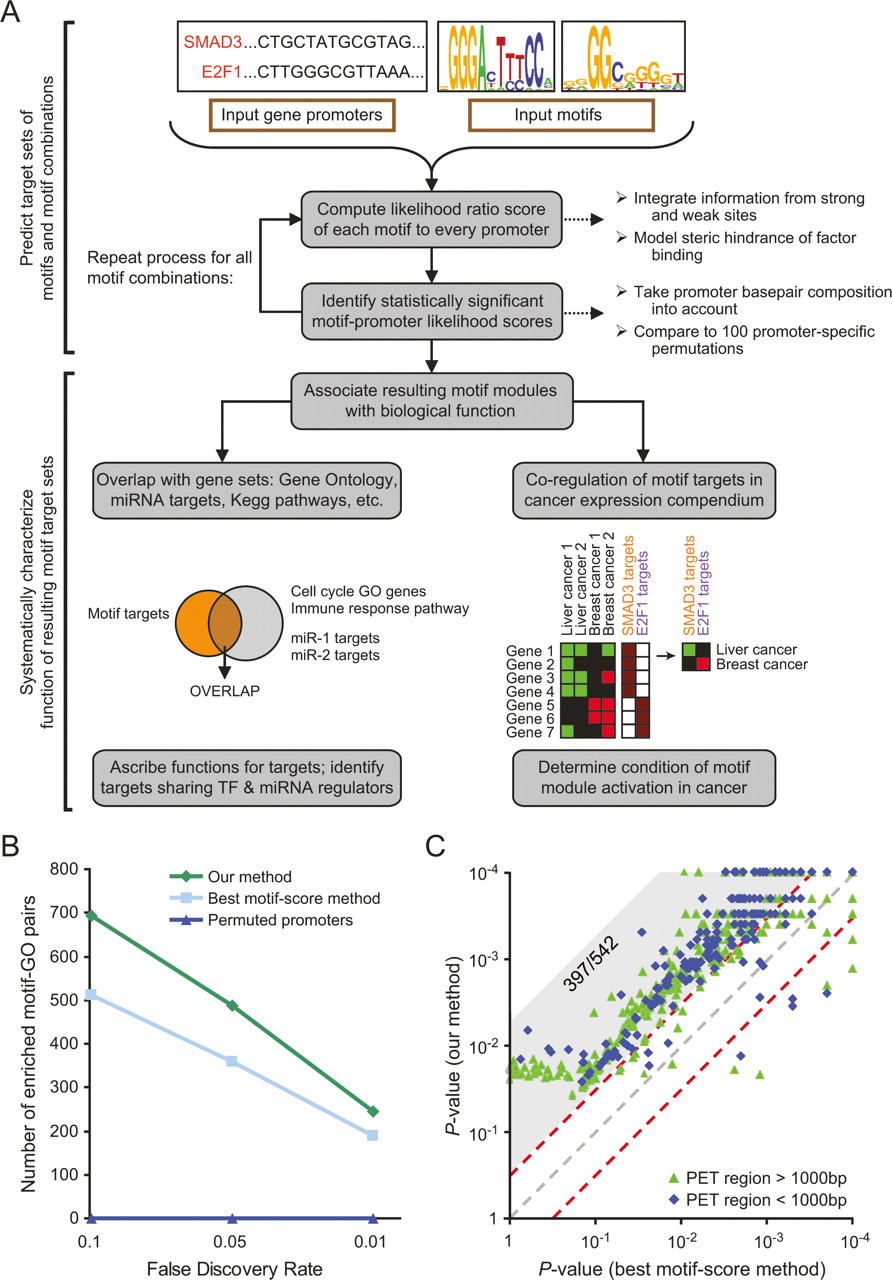 Overview of our approach and comparison to other methods. (A) Flowchart of our motif functional characterization pipeline. (B) Comparison of the number of significant enrichments between gene sets from Gene Ontology (GO) (Ashburner et al. 2000) and motif modules defined using our approach, GO and an alternative approach based on best motif occurrences, or GO and our approach applied to permuted promoters. For each particular FDR threshold f, the comparison shows the number of GO-motif target set pairs with FDR < f. (C) Comparison of the ability of our method (Y-axis) and best motif occurrences method (X-axis) to predict TP53 binding to 542 sequences experimentally measured to be strongly bound to TP53 by genome-wide chromatin immunoprecipitation followed by sequencing of paired end ditags (PET) (Wei et al. 2006). For each experimentally identified PET region, shown is the predicted binding P-value of each method, determined by comparing the likelihood score of the original region to that obtained in 10,000 regions randomly selected from the human genome. PET regions are separated into two types by their length (green and blue). Of the 542 PET regions, 397 have a fivefold lower P-value in our method (gray shaded area above diagonal), compared with nine with a fivefold lower P-value in the score-based method.