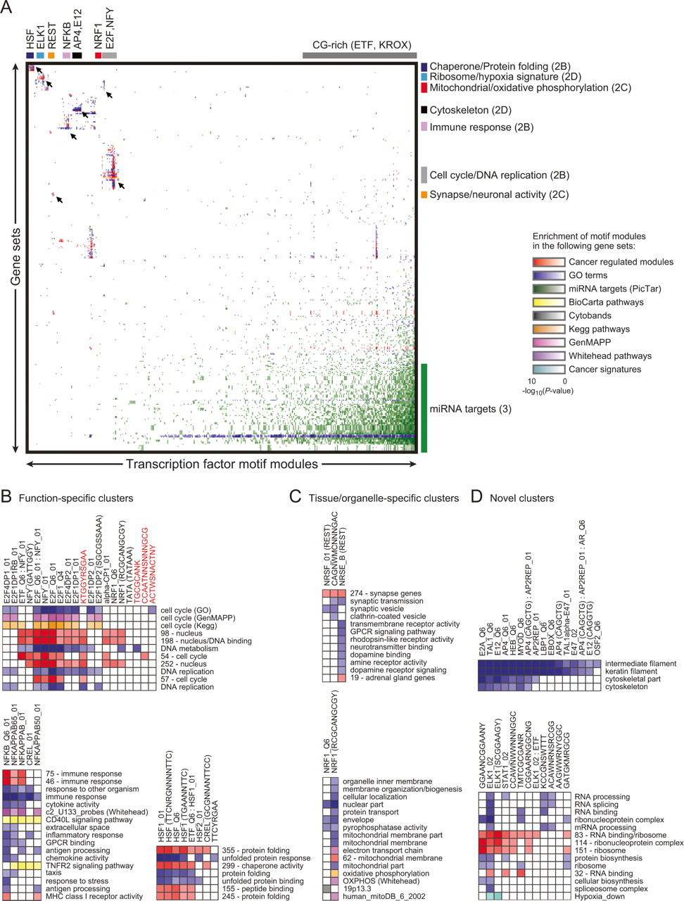 Functional analysis of motif modules. (A) Global view of specific transcription-factor motifs that are enriched in gene sets (by hypergeometric P-value). Different types of gene sets are distinguished by color, and their intensity corresponds to the significance of the motif module enrichment. Unsupervised clustering was applied to the resulting matrix. Several clusters are shown in detail (indicated by arrows), with the figure location in parentheses. (B) Detailed image of motif module clusters with function-specific enrichment. Novel conserved motif modules that we experimentally validated are highlighted in red. Notations following some transcription-factor names (ex. Q6_01) are identifiers for variants of the motifs according to TRANSFAC. Stand-alone sequences or sequences in parentheses following a transcription-factor name represent consensus binding motifs from ref. (Xie et al. 2005) (key for combination of nucleotides: Y = C or T; R = A or G; W = A or T; S = C or G; K = T or G; M = C or A; N = unknown). Individual motifs of motif combinations are separated by a colon. (C) Detailed image of tissue/organelle-specific enrichments. (D) Detailed image of novel enrichments.