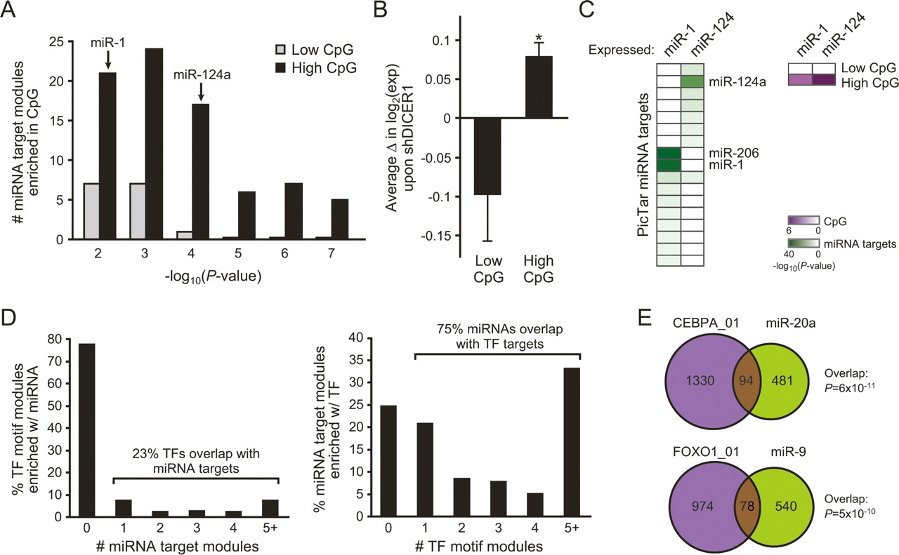 Extensive coupling between mechanisms of transcriptional and post-transcriptional control. (A) Shown is the number of gene sets of predicted microRNA targets (Krek et al. 2005; Lewis et al. 2005) that are significantly enriched for High or Low CpG promoter genes (Saxonov et al. 2006) (P < 0.05). The P-value of enrichment of the microRNAs analyzed in C is shown. (B) Concomitant change in genes expression in High vs. Low CpG promoter genes. Average expression (± SE) is shown. (*) P = 0.001, Student’s t-test. (C) Gene repression by microRNA overexpression (Lim et al. 2005). (Left) Coordinate repression of predicted microRNA target genes. (Right) Coordinate repression of high CpG promoter genes. Each column is a microRNA overexpression experiment; each row is a gene set of microRNA targets or CpG promoters. The degree of coordinate gene regulation over expectation by chance alone is quantified by the color scale. The enrichment of miR-206 targets in miR-1 overexpression is due to the 98% overlap of their predicted targets by PicTar (Krek et al. 2005). (D) A common modularity between motif modules and microRNA targets. We compared singleton motif modules with fewer than 1000 member genes against predicted microRNA targets (PicTar). (Left) Percentage of motif modules whose targets are enriched in the targets of k different microRNAs, for k = 1, 2, 3, 4, >5. (Right) Percentage of microRNA target modules whose targets are enriched in the targets of k different motif modules, for k = 1, 2, 3, 4, >5. (E) CEBPA_01 targets significantly overlap with miR-20a targets (P = 6 × 10−11), and FOXO1_01 targets significantly overlap with miR-9 targets (P = 5 × 10−10).