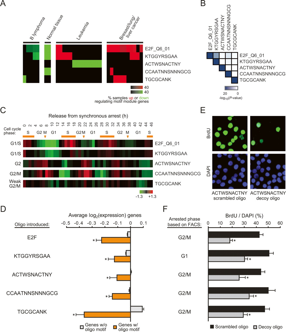 Uncharacterized motifs regulate cell cycle progression. (A) Clinical annotation enrichment of the array signature of E2F_Q6_01 and the four uncharacterized motif modules. (B) Significance of enrichment of the indicated motif module target genes with all other motif targets is shown. (C) Shown is the average expression of the indicated motif module genes found in a set of periodically expressed cell cycle genes in HeLa cells (Whitfield et al. 2002). The stage of cell cycle that the pattern of expression most resembles is indicated on the left. Orange bars signify S phase; arrows signify mitoses. (D) Decoy oligos corresponding to the uncharacterized motif sequences inhibit target gene expression in HeLa cells. Shown is the average log2 gene expression (± SE) of genes predicted to have the indicated motif (orange) or those that lack the motif (gray). (*) P < 0.05 compared with genes without motif, Student’s t-test. (E,F) Decoy oligos inhibit cell cycle progression in HeLa cells. (E) Example of BrdU immunofluorescence staining and DAPI counterstain after introduction of scrambled oligos or decoy oligos for the ACTWSNACTNY motif. (F) Average percentage (± SE) of BrdU-positive cells after transfection of the indicated scrambled or decoy oligos. The cell cycle phase in which the cells arrested (as determined by FACS) is indicated on the left. (*) P < 0.01 compared with the respective scrambled oligo, Student’s t-test.