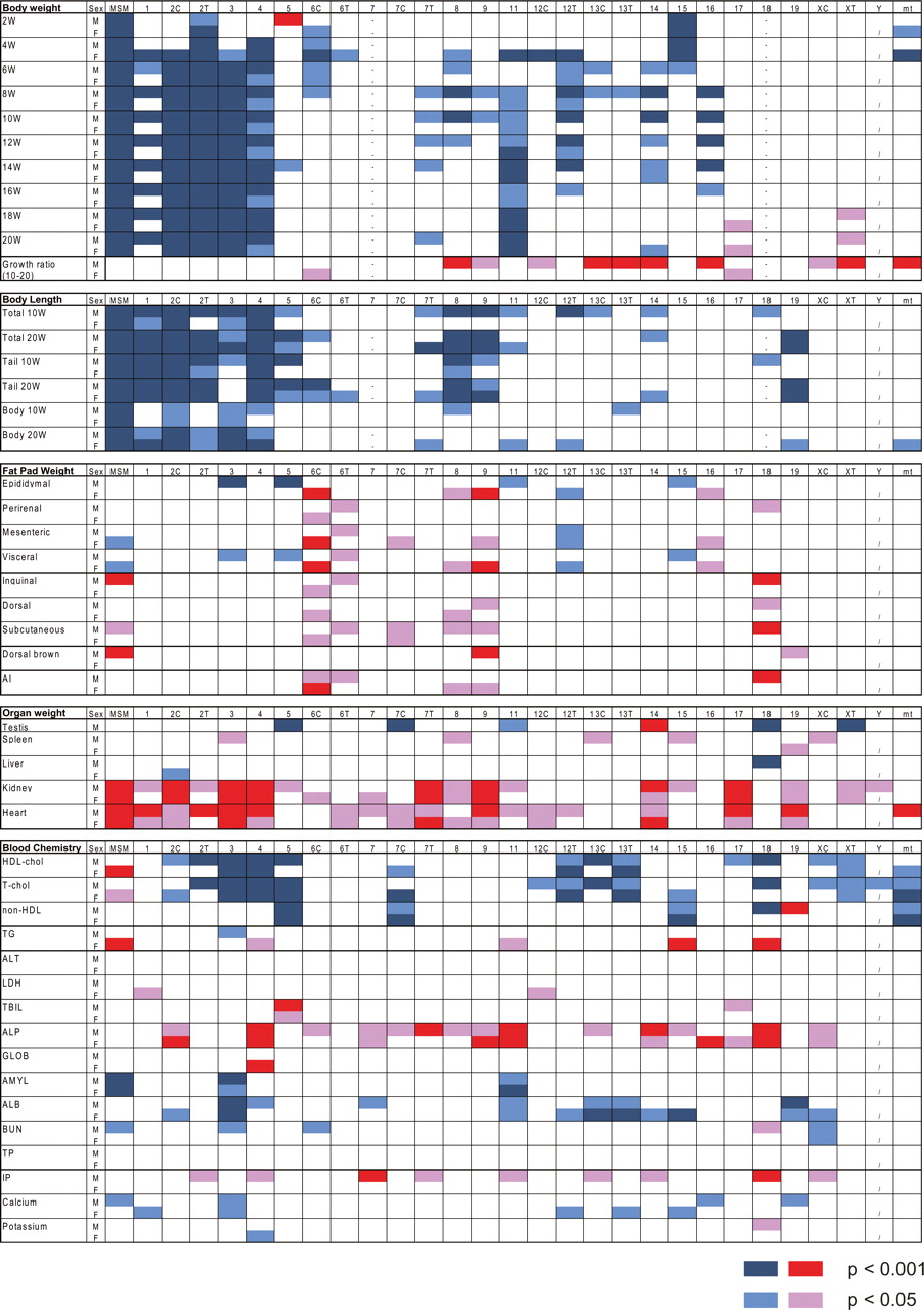 Summary of comprehensive phenotyping of the consomic panel. The upper half of each box indicates the result obtained in males, and the lower half, the result in females. Red and magenta boxes indicate values larger than those of the host B6 strain. Highly significant values (P < 0.001) are shown in red, and all other statistically significant values (P < 0.05) are shown in magenta. Dark blue and light blue boxes indicate values lower than those of B6. Highly significant values (P < 0.001) are shown in dark blue, and all other statistically significant values (P < 0.05) are shown in light blue.
