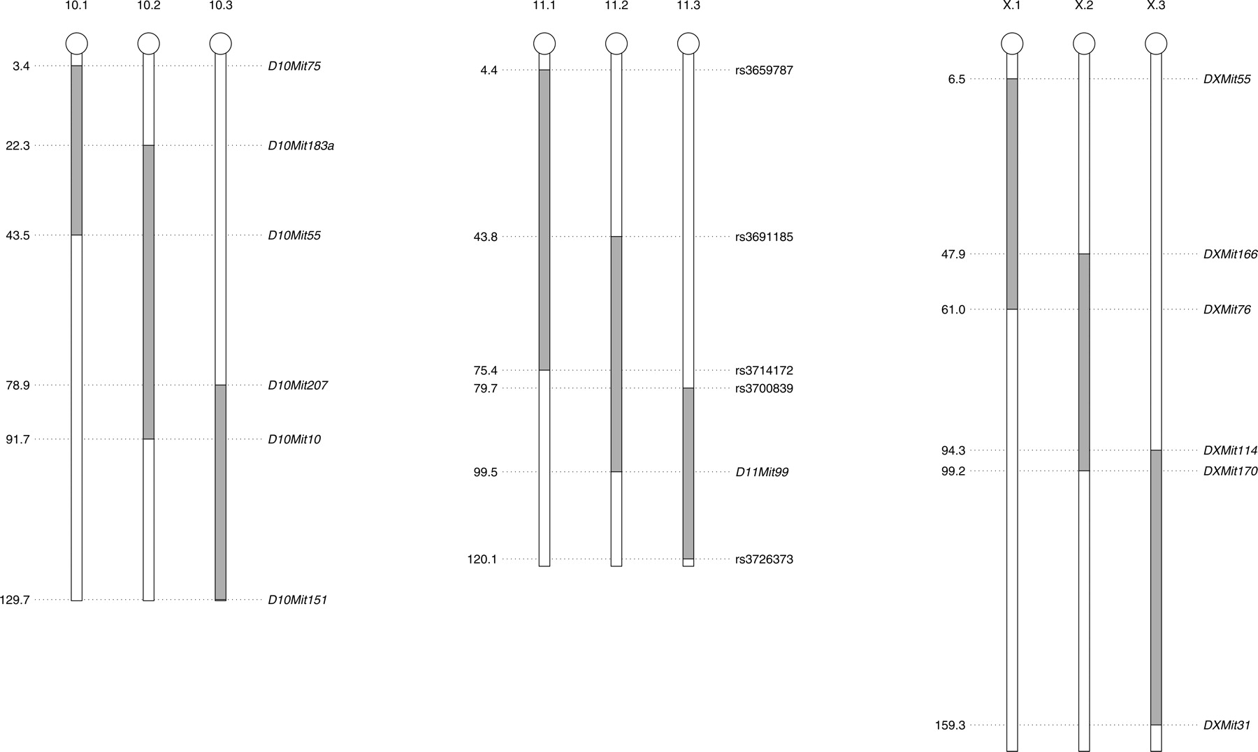 Scheme of introgressed regions in subconsomic strains. The borders of PWD intervals (gray) were mapped to the closest neighboring single nucleotide polymorphism (SNP) or SSLP. Megabase scale.